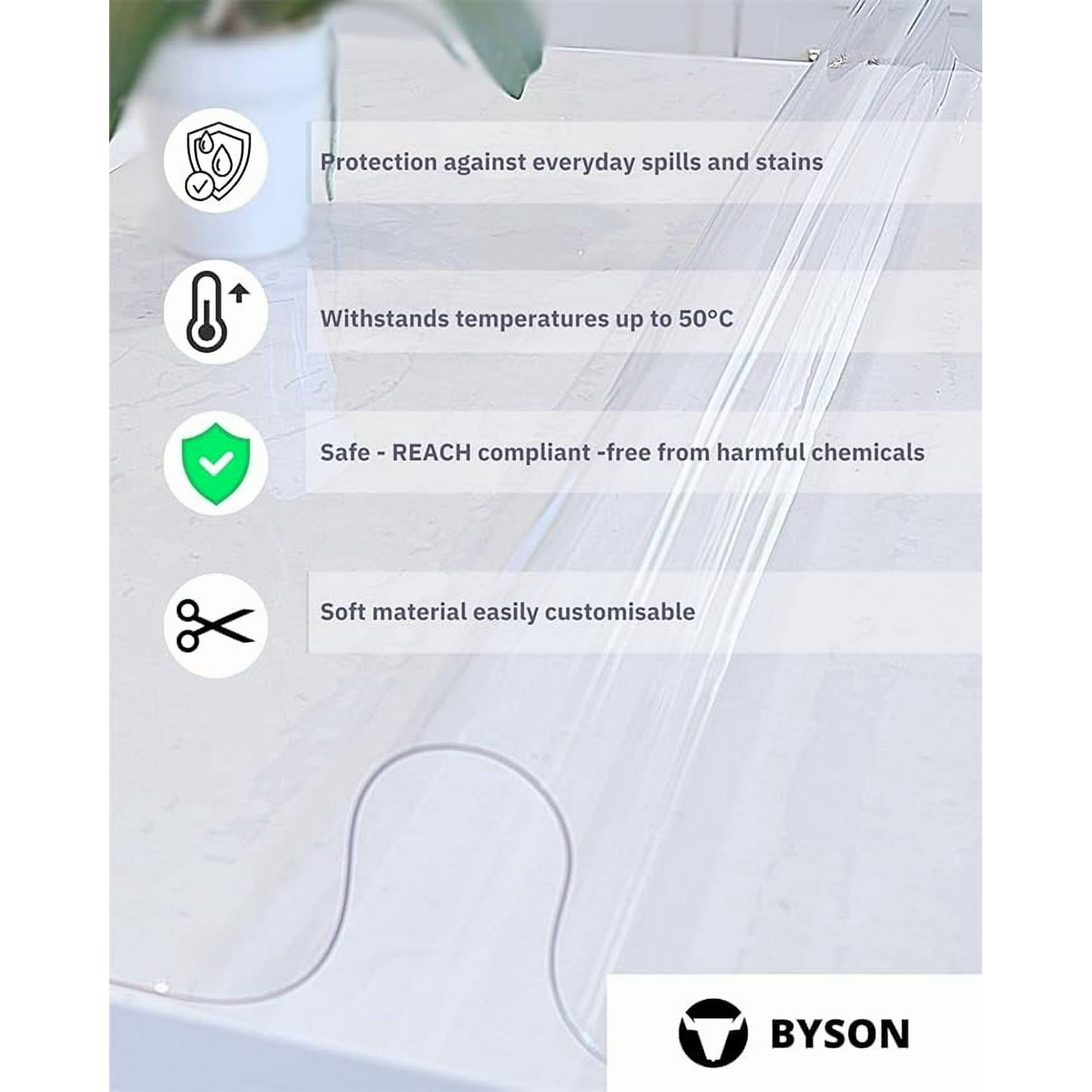 Vous pouvez marquer la mesure exacte avec des ciseaux tranchants, un crayon et une règle pour faire une coupe parfaite. Cette nappe en PVC vinyle transparent laisse voir le bois tout en le protégeant des taches, rayures et liquides. Sans odeur, sans BPA. Format 150cm rond (léger... Protection de bureau transparente en PVC de 1 mm d'épaisseur Résiste à la chaleur jusqu'à 80 °C. OstepDecor Protection Transparente De 1,5 Mm D'épaisseur, 122 X 71 Cm, En Plastique - Pour Table De Salle à Manger, Table En Bois De Cuisine Ces nappes en plastique peuvent être utilisées non seulement comme nappes rectangulaires, mais également comme protections de bureau ou sets de table... Byson Protection de table en PVC imperméable en vinyle pour table de salle à manger, table basse de 1,5 ou 2 mm d'épaisseur (1,5 mm d'épaisseur, 91,4 x 121,9 cm) Protection : protégez votre table ou nappe contre les rayures, les éraflures, les taches, les déversements tout en gardant votre bureau bien rangé, propre et organisé
