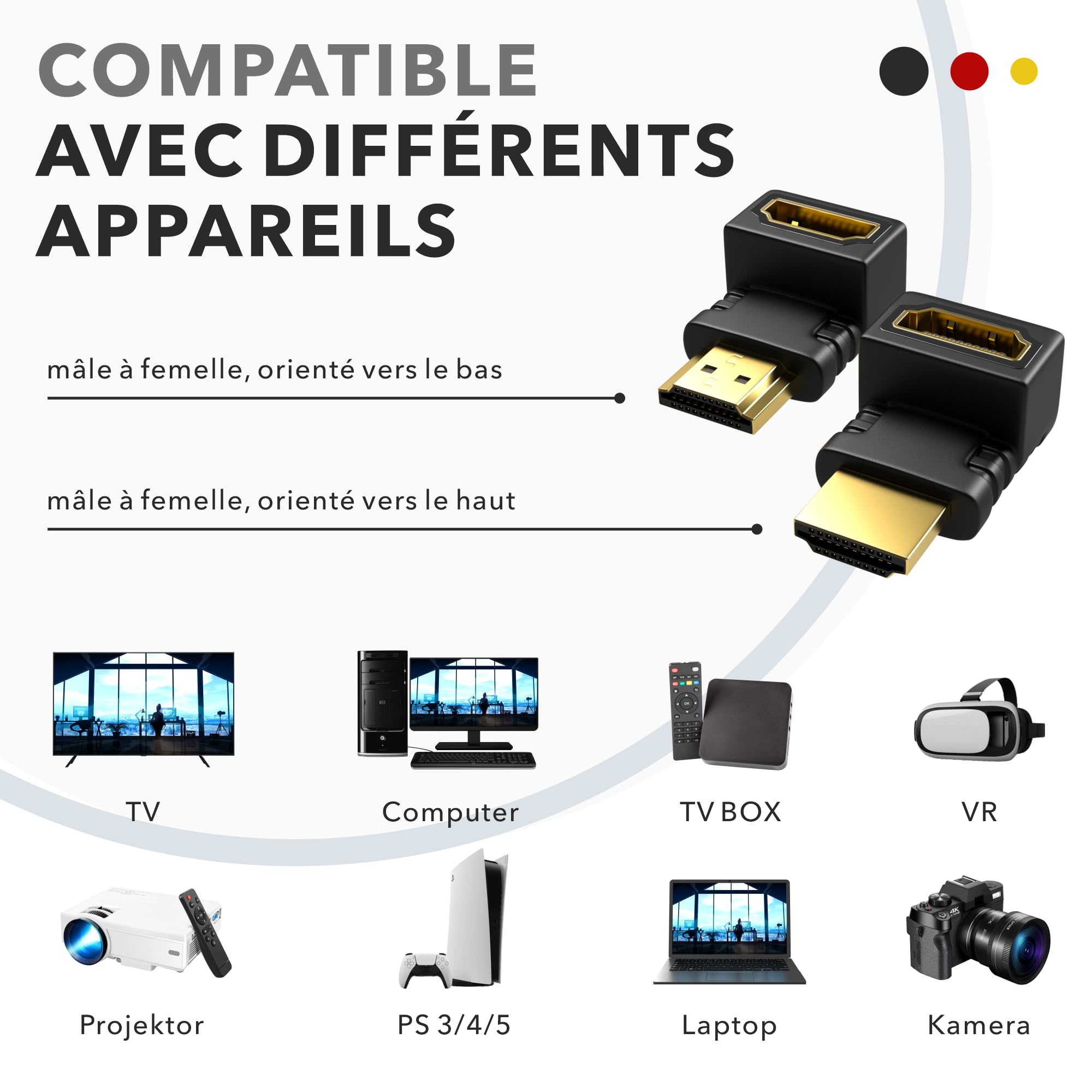 Compatible avec tous les appareils HDMI standard tels que PS3, PS4, XBox, Fire TV, lecteurs DVD ou Blu Ray et de nombreux autres appareils compatibles HDMI. Répond à toutes les exigences : Adaptateur haute vitesse pratique - La fiche HDMI coudée à 90° et 270° de RedStar24 peut être utilisée comme adaptateur pour les câbles dans les endroits difficiles. L'adaptateur est équipé de HDMI 2., 0., Il est également rétrocompatible avec HDMI 1., 0, 1., 1, 1., 2, 1., 3, 1., 3abc, 1., 4, 1., 4a, 1., 4b. Adaptateur HDMI mâle vers femelle coudé à 270° CVBW34902AT Pour faire une position difficile à brancher en un clin d'œil. Compatible avec tous les appareils HDMI standard tels que PS3, PS4, XBox, Fire TV Stick, lecteurs DVD ou Blu-ray et de nombreux autres appareils compatibles HDMI. Nedis Câble HDMI coudé à 270° haute vitesse avec Ethernet Noir (1.5 mètre) - HDMI - LDLC... Qualité de marque testée - Le connecteur RedStar24 offre une transmission optimale du signal avec des performances constantes sans compromis. Profitez d'une expérience TV sans restriction au plus haut niveau sans compromettre la qualité d'image ou le son. Pour rendre une position difficile à insérer en une position simple. Si quelque chose ne va pas avec votre produit, nous vous rembourserons immédiatement votre argent sans poser d'autres questions. La connectique n’a pas de secrets pour vous ? Alors vous devez forcément posséder chez vous un ou plusieurs câbles HDMI, qui nous servent au quotidien pour relier nos appareils électroniques. vous propose une large sélection de câbles de connectique audio et vidéo en 4K. Que ce soit pour raccorder votre télévision, votre box ou votre lecteur DVD, vous trouverez également... Adaptateur Hdmi Coudé RedStar24 2 Pack HDMI Adapter Angled 90 And 270 Degree | Type A Female And Male | Gold Plated Connector | 4K Ultra HD UHD 3D Full HD 1080p HDR ARC Cable Hdmi Plat Adaptateur haute vitesse pratique - La fiche HDMI coudée à 90° et 270° de RedStar24 peut être utilisée comme adaptateur pour câbles dans les endroits difficiles.