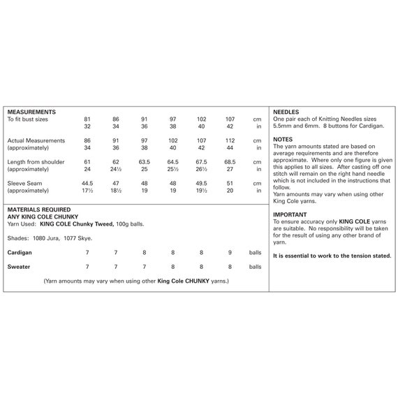 Libérez votre créativité avec les patrons de tricot King Cole Découvrez une superbe gamme de designs pour inspirer votre prochain projet. Gamme de tailles : 81,3 à 106,7 cm., Manches raglan Modele de tricot - Pull-over en grosse maille en mohair epais No15 Cet article de la catégorie Patrons et modèles proposé par CuddlePlushFabrics a été mis en favoris 3 fois par des acheteurs . Pays dexpédition : Grande-Bretagne. Mis en vente le 17 juin 2025 Remarque : Il s'agit d'une brochure de patron de tricot, pas les vêtements présentés. Pattern 6336 Modèle De Tricot King Cole Chunky Tweed - Cardigan Et Pull 4743 - France Knitting Patterns To Download For Ladies Des pulls confortables et des accessoires élégants aux adorables tricots pour bébé et à la décoration intérieure charmante, King Cole propose des modèles de haute qualité et faciles à suivre pour les tricoteuses de tous niveaux. Commencez votre prochaine aventure de tricot avec King Cole! Fabriqués avec leurs beaux fils à l'esprit, ces motifs garantissent des résultats époustouflants que vous serez fier de créer et de chérir. Petits prix et livraison gratuite dès 25 euros d'achat sur les produits King Cole. Commandez King Cole Patron de tricot en tweed épais - 6110 Pull et cardigan