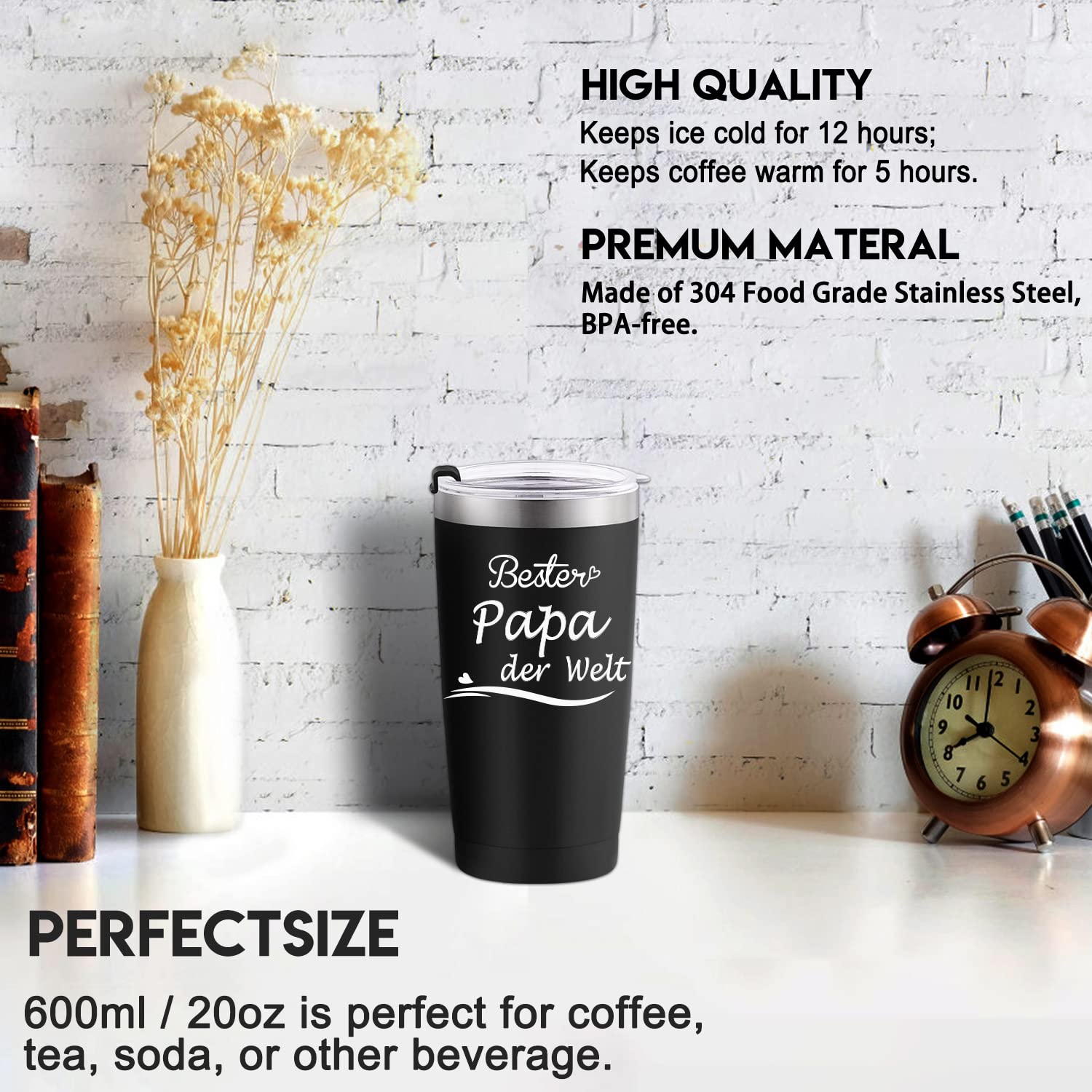 Cadeau d'anniversaire pour papa : papa a a bientôt Birthday, has toujours kummer, comment exprimer votre amour pour votre papa ? Les verres à vin Livole sont un choix idéal de cadeaux parfaits pour votre père, en outre, vous pouvez exprimer votre amour et vos meilleurs vœux directement à votre père. Idée cadeau dernière minute fête des pères : simple, rapide et efficace Un excellent choix pour la maison, le camping, les vacances, le sport, les voyages, les verres à vin en acier inoxydable. Idées Cadeaux Pour Papa Livole Cadeau Pour Papa, Fête Des Pères, Tasse Du Monde « Weltbester Papa », Cadeaux Pour Idées Cadeau Anniversaire Papa Le gobelet à vin est fabriqué en acier inoxydable de qualité alimentaire, sans BPA, durable, moderne, motif clair et résistant à l'usure. Tasse à café isolée avec des mots drôles Comme Un Papa Normal Mais Plus Génial, parfait comme cadeau pour papa · Fait de 304 18/8 acier inoxydable de qualité... Nous promettons un remboursement à 100 % ou un remplacement si vous n'êtes pas satisfait de notre coffret cadeau pour verres à vin. Étui de protection anti-éclaboussures de qualité supérieure : le couvercle sans BPA et anti-éclaboussures peut protéger contre les déversements et les garder propres lorsque vous buvez du café ou du vin dans le jardin lorsque vous bougez ou que le verre à vin dans votre voiture avec du café ou du vin. Double isolation sous vide : le gobelet à vin double isolation de 600 ml peut garder vos boissons chaudes pendant 5 heures et froides pendant 12 heures.