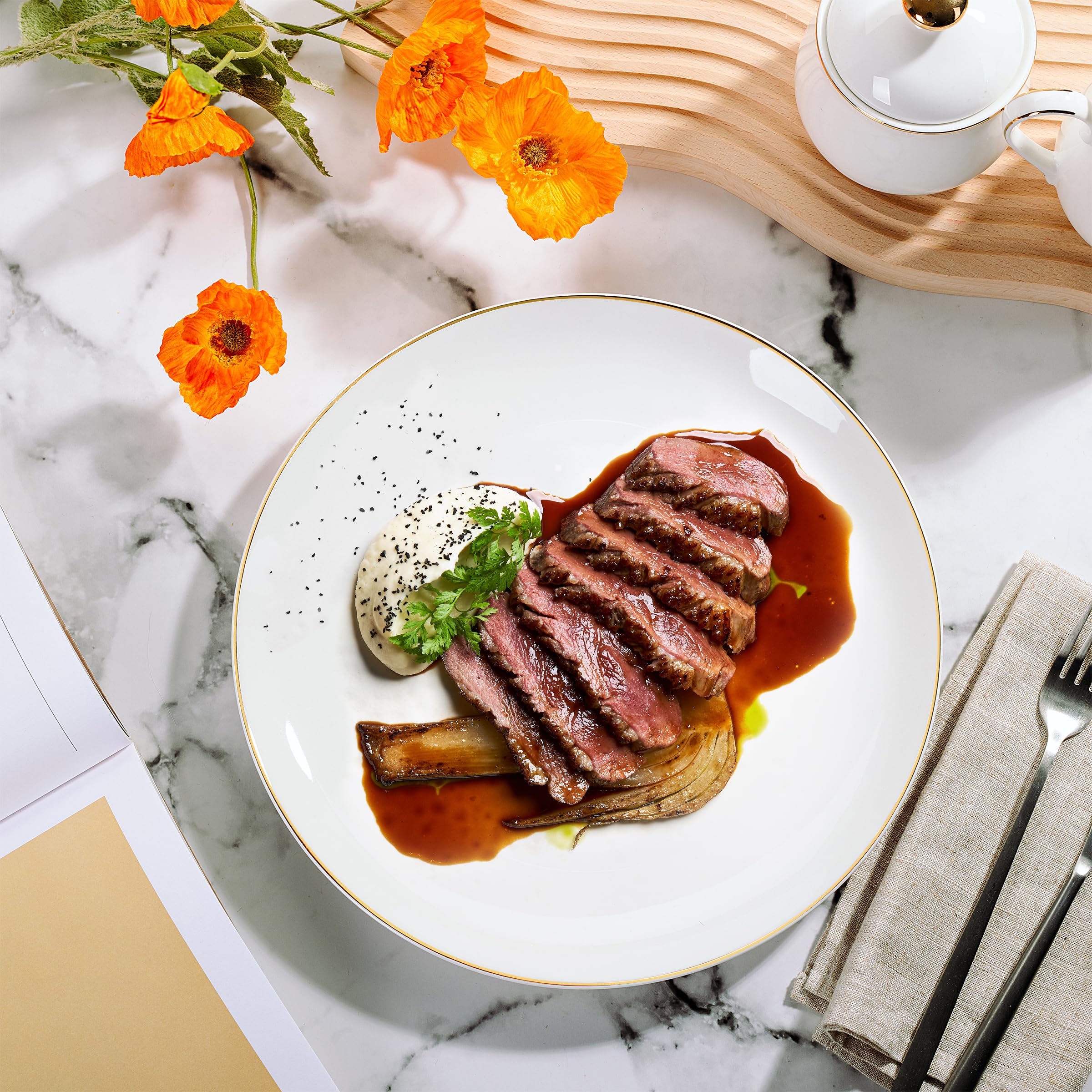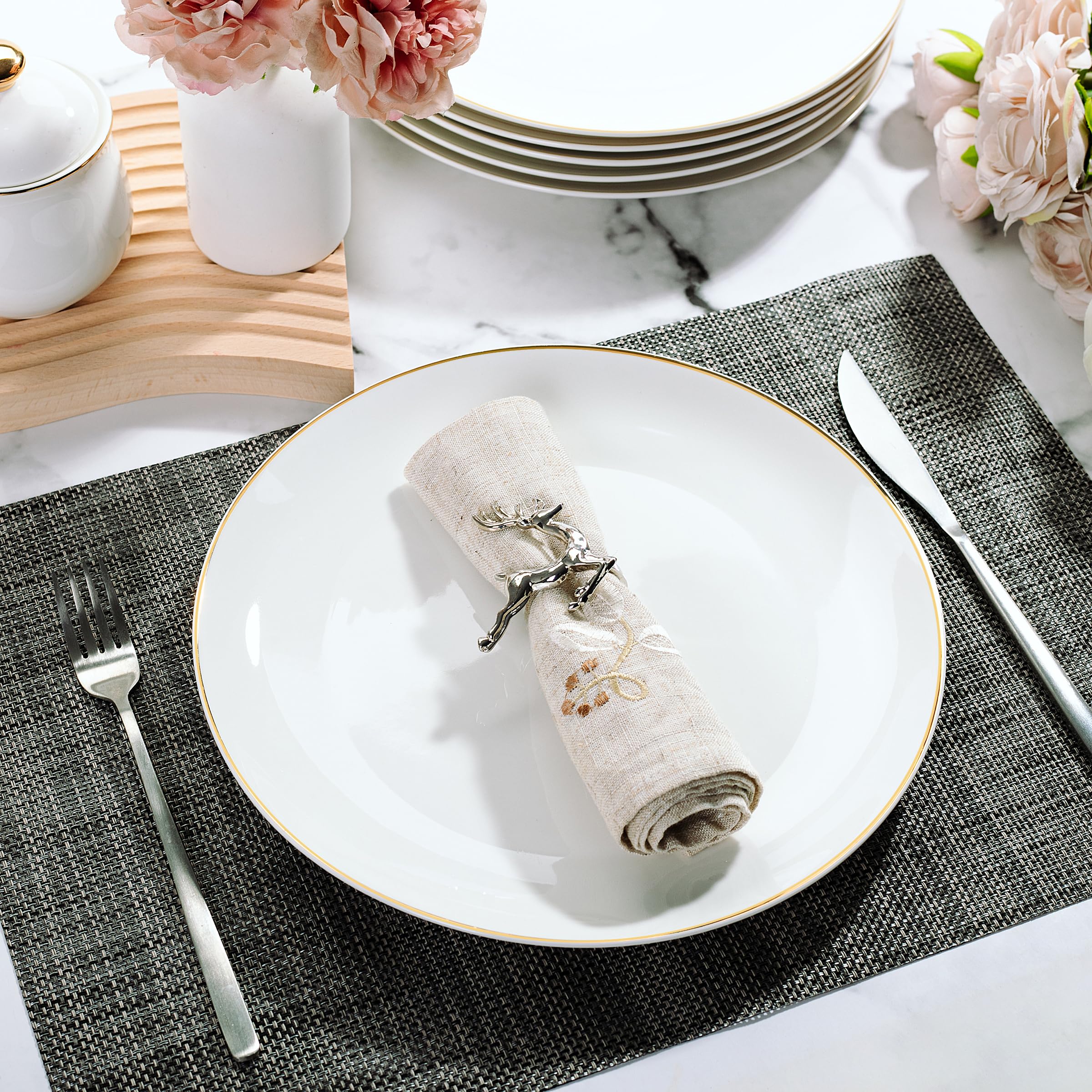 Lot de 6 assiettes plates en grès blanc 26cm Charlotte | Maisons du Monde Dimensions : → Hauteur : 2,5 cm → Diamètre : ø 24,5 cm → Poids : 2,8 Kg Assiettes Plates Porcelaine BTaT - Lot De 6 Assiettes à Dessert Blanches De 20,3 Cm En Assiettes Plates Blanches Malgré leurs détails ornés, ces assiettes sont conçues pour être pratiques et faciles, car elles sont assez compactes pour un rangement et une présentation pratiques dans n'importe quelle armoire ou étagère en porcelaine. Set de 6 assiettes plates blanches en porcelaine avec liseré doré (Ø26,5 cm). Assette en porcelane avec lseré doré (lot de 6) (assettes plates... L'ensemble d'assiettes BTaT dispose d'un élégant ensemble de 6 assiettes plates, chacune avec un diamètre généreux de 26,7 cm, offrant suffisamment d'espace pour les plats principaux, les grandes salades ou les portions de pâtes. Fabriquées à partir de porcelaine de qualité supérieure, ces assiettes offrent à la fois la durabilité nécessaire pour un usage quotidien et la grâce nécessaire pour les dîners formels, ce qui en fait un ajout polyvalent à n'importe quelle table.