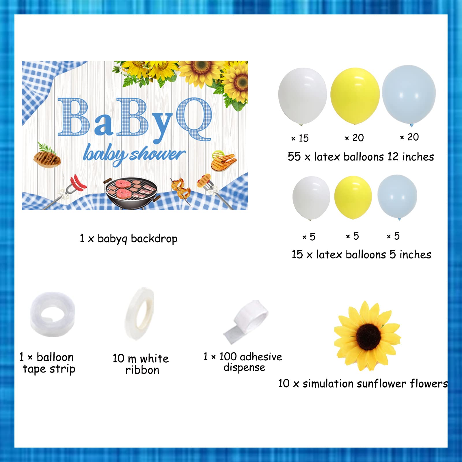 1 distributeur de 100 adhésifs Et vous pouvez coller les tournesols artificiels sur le mur ou sur la guirlande de ballons ! Décorations Bleues de Baby Shower Fête Prénatale pour Garçons avec It's Balloon Arch Garland Kt 129 Pece - Etsy UK | Ballons de fête... Nous avons une bande de ruban adhésif pour ballons et des points adhésifs transparents double face pour vous aider à assembler les ballons. Décorations De Fête Prénatale Pour Garçons, Décorations De Fête Contenu : Cette décoration de fête prénatale sur le thème du barbecue comprend 1 toile de fond pour bébé Q de 1 x 1,5 m, 55 ballons en latex de 30,5 cm, 15 ballons en latex de 12,7 cm, 10 tournesols simulés, 1 bande de ruban adhésif pour ballon, 1 distributeur de 100 adhésifs. Vous pouvez accrocher le tissu de fond sur le support, et vous pouvez également l'accrocher au mur avec des clous, du ruban adhésif, des bandes de commande. Nombreuses utilisations : ces fournitures de fête Baby Q sont parfaites pour les pique-niques, les fêtes sur le thème du barbecue, les fêtes prénatales, les fêtes d'anniversaire sur le thème du barbecue, etc. Kit D'Arche de Guirlande de Ballons Bleus pour Fête Prénatale 214...