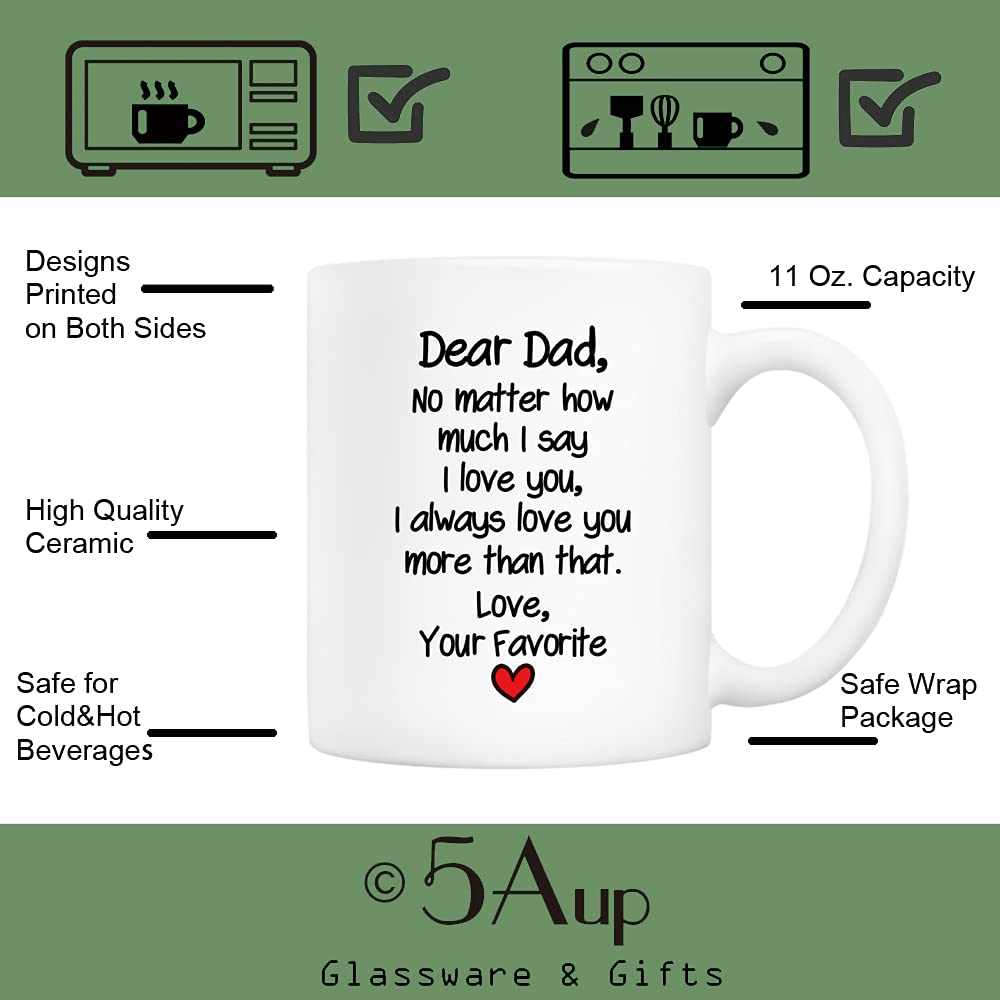Toutes vos boissons préférées. Voici l'heure du café! Cadeau d'anniversaire et idées de cadeau de Noël pour lui ou elle. Offrez ce bijou à votre maman, papa, fille, sœur, petit ami, petite amie, mari, épouse, collègue de travail masculin ou féminin, fille, grand-père, grand-père ou petite-fille, ou votre meilleur ami pour un anniversaire, Noël, la Saint Valentin, la fête des pères ou la fête des mères. Mug humoristique pour la fête des pères – Cher Papa – Cadeau drôle et Excellent cadeau pour les amateurs de café qui apprécieront pendant des années. Cadeau idéal pour homme et femme. 100% céramique blanche pure et votre satisfaction est garantie. Peut contenir 325 ml de votre café, thé ou boisson préférée, taille parfaite pour commencer votre matinée. Cette tasse hilarante est un excellent cadeau de Noël, un cadeau d'anniversaire cool pour les femmes ou les hommes, et un cadeau parfait pour les fêtes de bureau, les événements et les fêtes de mariage. 5Aup Mug à Café Humoristique Pour Fête Des Pères Inscription Idées de cadeau parfaites pour la fête des mères pour maman de fille ou de fils, idées de cadeau de fête des pères pour papa, idées de cadeau de Saint-Valentin, de Hanukkah.