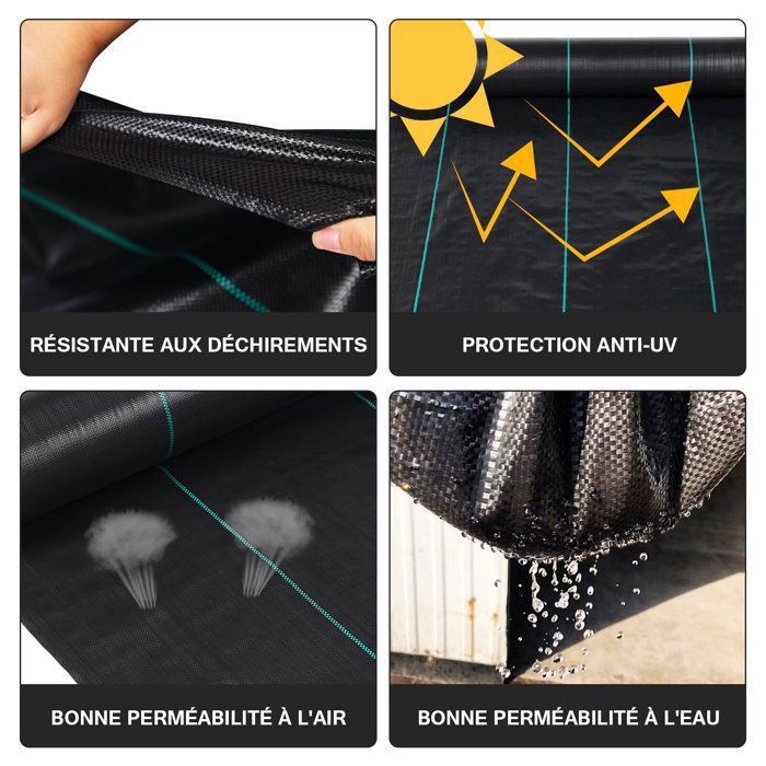Dihl Membrane anti-mauvaises herbes 1 m x 10 m : une solution fiable conçue pour garder votre jardin exempt de mauvaises herbes et maintenir son attrait esthétique. Contrôle efficace des mauvaises herbes : empêche la lumière du soleil d'atteindre le sol, empêchant la croissance des mauvaises herbes tout en permettant à l'air, à l'eau et aux nutriments de pénétrer, favorisant une croissance saine des plantes. Comment poser ma toile de paillage anti-mauvaises herbes? Enlever les mauvaises herbes et ratisser le sol. Scheinen Lächeln Umfang bache de jardin mauvaises herbes Mäander Mutter Uluru Toutes les membranes de mauvaises herbes Dihl sont fabriquées à partir d'au moins 50 % de matériaux recyclés, ce qui signifie qu'elles sont beaucoup plus écologiques que les autres sur le marché. Construction robuste : fabriquée à partir de tissu noir durable de 100 g/m², cette membrane anti-mauvaises herbes offre une résistance et une résilience supérieures contre la pénétration des mauvaises herbes. Membrane Dihl contre les mauvaises herbes Black Garden Membrane anti-mauvaises herbes La membrane anti-mauvaises herbes Dihl peut être utilisée pour toutes sortes de projets d'aménagement paysager autour du jardin. Perméable à l'eau : le matériau permet à l'air, à l'eau et aux nutriments de pénétrer dans le sol sous-jacent tout en arrêtant les mauvaises herbes Ils sont faciles à poser et à installer, tout en offrant une protection UV pour une longue durée de vie au jardin. Découpez ensuite des trous de plantation cruciformes dans la toile. Bâche Jardin Mauvaise Herbe 5 M² Tissu De Sol, Bâche Anti-mauvaises Herbes, Bâche De Paillage, 100 G, 1 M De Large, Noir - Gamm Vert Bâche Pour Mauvaises Herbes Poser la bâche et la fixer avec les piquets de fixation pour de meilleurs résultats. Membrane Dihl contre les mauvaises herbes Très résistant 100 g/m² La membrane est perméable à l'eau afin que l'eau et les nutriments puissent circuler à travers le tissu, réduisant ainsi les risques de flaques d'eau sur la surface. C'est le produit idéal pour protéger les allées, les chemins de jardin, les pavés, les sols de serre et bien plus encore contre les mauvaises herbes. Grande zone de couverture : avec des dimensions de 1 mètre de large par 10 mètres de long, offrant environ 9,9 m² de couverture, cette membrane est adaptée pour couvrir de plus grandes zones de jardin avec facilité. La protection contre les UV est également utilisée pour soutenir durablement votre jardin. Matériau : Polyéthylène haute résistance; Grammage : 100g/m²; Dimensions : 1m x 10m; Surface de couverture : 10m². Avantages de cette toile de paillage...