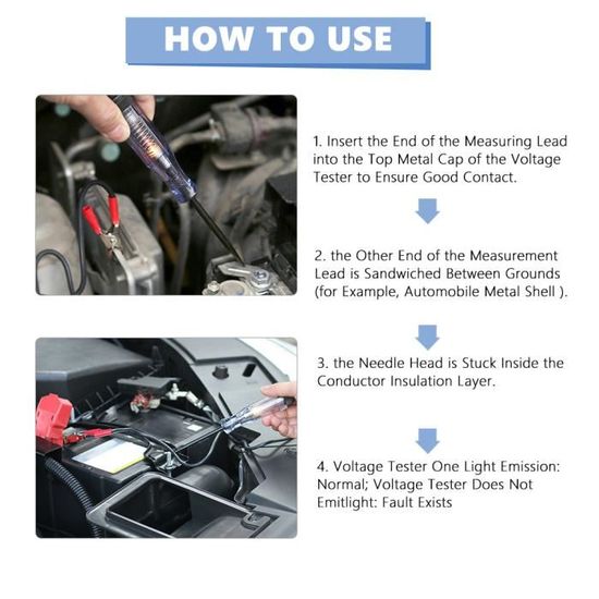 Conçu pour détecter les défauts de circuit basse tension dans les machines de transport. Vérifiez rapidement les phares automobiles, feux arrière, circuits de clignotants, prises défectueuses, connexions, fusibles, fils cassés et plus encore. TuNan Testeur de circuit de voiture 6 V-12 V-24 V DC, test professionnel de continuité de tension, témoin de tension électrique automobile/longue sonde pour fil/fusible/prise et plus encore – Noir Il y a 3 jours · Testeur de fonctionnement pour voiture - 6-24 V - Avec lumière LED - Suivi du circuit court - Location et alarme buzzer - Test de polarité et fonction de test de continuité Utilisé pour détecter l'alimentation, la terre, trouver des shorts et des ruptures dans les fils. Testeur Electrique Auto TuNan Testeur De Circuit De Voiture 6 V-12 V-24 V DC, Test De Lampe Temoin Vérifiez rapidement les phares, les feux arrière, les circuits de clignotants, les prises défecuses, les connexions, les fusibles, les fils cassés et plus encore. Conçu pour détecter les pannes de circuit à basse tension dans les machines de transport. Matériau : plastique AS, poignée en acier au carbone ; longueur de la ligne : environ 103 cm, longueur du clip : environ 128 cm Le Testeur De Circuit Automobile Est Idéal Pour Vérifier Les Circuits, Les Fusibles, Les Interrupteurs Et Le Câblage Des Automobiles, Des Remorques...