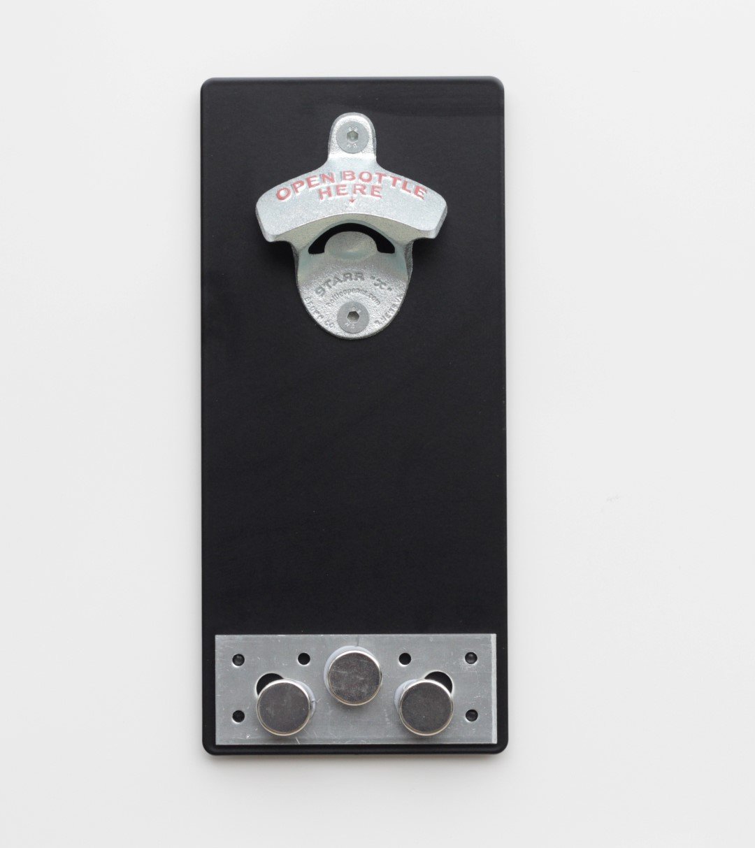 L’aimant retient jusqu'à 60 capsules après l'ouverture des bouteilles. La grappe de capsules peut être décollée simplement en inclinant la plaque en tôle, donc pas besoin de récupérer chaque pièce une à une péniblement. Garantit le maintien des capsules de 3 caisses de bière (soit 60 capsules). Simplement déballer et positionner sur une surface adhésive magnétique (par exempleune porte de réfrigérateur, un compartiment à fusibles, un tableau d’affichage, une porte métallique, un châssis). On entend d'abord un sifflement lors de l'ouverture, puis un déclic lorsque la capsule est attirée dans sa chute par l'aimant et se retrouve piégée. Une astuce de Flux :faites plaisir à votre meilleur ami, votre père, votre beau-père, votre frère, votre voisin ou quiconque. Découvrez notre ouvre-bouteille mural magnétique ! Il est doté d'une tête d'éléphant et d'un panier pour ranger toutes vos capsules. De plus, il est aimanté... Décapsuleur mural aimanté sans montage (original Starr-X, USA) sur plaque en acier noir avec aimants pour capsules (Dimensions : H 25 x l 11 x p environ3 cm). Commandez un décapsuleur FLUX pour lui aussi. Contenu :1 décapsuleur mural avec aimant entièrement monté (1 décapsuleur en fonte et 1 plaque en acier noir et 1 aimant en néodyme et 1 plaque en tôle et 3 aimants arrières en néodyme, antidérapants)., Poids : environ0,8 kg. Contenu :1 décapsuleur mural avec aimant entièrement monté (1 décapsuleur en fonte et 1 plaque en acier noir et 1 aimant en néodyme et 1 plaque en tôle et 3 aimants arrières en néodyme, antidérapants). Décapsuleur mural avec aimant/piège magnétique plaque en tôle Décapsuleur Pour Bouteille Décapsuleur/ouvre Bouteilles Mural Magnétique / Décapsuleur Pour Décapsuleur Mural Original Le montage est simple, les instructions sont incluses (français non garanti).