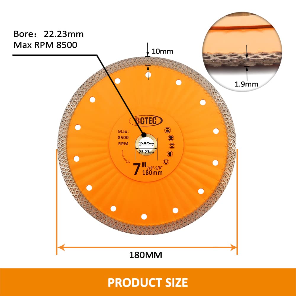 Compatible avec les scies circulaires, scies à maçonnerie, etc BGTEC Lot de 3 lames de scie diamant pour porcelaine, 180 mm, disque de coupe diamant à bord en maille super fine avec arbre de 2,2 cm à 5/8 pour granit... 4,5 polegadas M14 galvanizado diamante moagem disco viu a lâmina para granito má Tête de coupe ultra-mince avec segments à bordure maillée, offrant une coupe rapide, lisse et sans éclats Coupe Carreaux Electrique A Eau BGTEC 1 Lame De Scie Diamant Super Fine De 22,9 Cm Avec Tige De 2 Disque Diamant 180 Carrelage Diamètre : 180 mm, alésage : 22,23 mm, Utilisation à sec ou humide sur la coupe du marbre, du granit, de la porcelaine, du carrelage, de la céramique, du béton, des matériaux durs et plus encore, Utilisations multiples : peut être utilisé comme lame de granit, lame de carrelage en céramique, lame de carrelage en porcelaine, lame de maçonnerie, etc., Lames de scie diamant avec bord... La structure unique de la turbine ultra-mince (lame de 1,2 mm + rainure déflectrice à mailles) permet une coupe sans copeaux, des coupes lisses et nettes, et réduit la perte de matériau de 30 %. Lame de scie diamantée 1 pièce ; Diamètre 180MM, Alésage 7/8(22., 23MM), Anneau de réduction 22., 23/15., 875MM ; Hauteur de la fraise diamantée : 10mm., Épaisseur : 1., 9 mm.