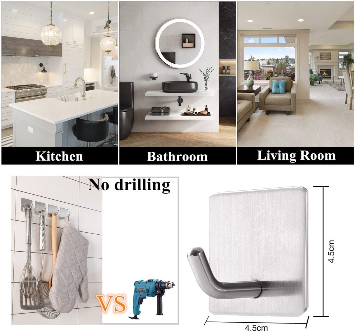Aucun perçage nécessaire. Ils sont faciles à enlever car aucun trou, trace ou résidu collant n'est laissé. Aide à économiser beaucoup d'espace et vous donne une vie confortable et bien rangée. Lot De 4 Crochets Muraux Ronds, Crochets à Serviettes En Acier Inoxydable Crochets Autocollants Aucun Percage Requis Adaptes A Salle De Bain 92248887 Facile à installer : pas besoin d'outils ou d'endommager le mur. (Ils ne conviennent pas pour le papier peint non lisse, les murs en plâtre ou toute surface texturée rugueuse). Lot de 4 crochets autocollants en acier inoxydable très résistants et imperméables à la rouille pour murs de porte, salle de bain, cuisine, chambres, bureau... Gain de place : ces crochets adhésifs aident à garder votre maison propre et bien rangée. Idéal pour la chambre, la salle de bain, le salon, les toilettes, le bureau, etc. Large application : ils peuvent être utilisés sur une grande variété de surfaces lisses, telles que le bois, le verre, le marbre, les carreaux de céramique, etc. Design tendance : la couleur argentée tendance, la finition brossée et le design compact rendent ces crochets adhésifs compatibles avec toutes les autres décorations d'intérieur modernes., Dimensions : 4,5 x 4,5 cm. Facile à installer : pas besoin d'outils ou d'endommager le mur. Aucun perçage nécessaire. Il suffit de nettoyer et de sécher soigneusement la surface de... YIAGUN Lot De 4 Crochets Adhésifs En Acier Inoxydable Imperméables Matériau de qualité supérieure : les crochets autocollants sont fabriqués en acier inoxydable 304, résistant à la corrosion, imperméable, résistant aux rayures et durable.