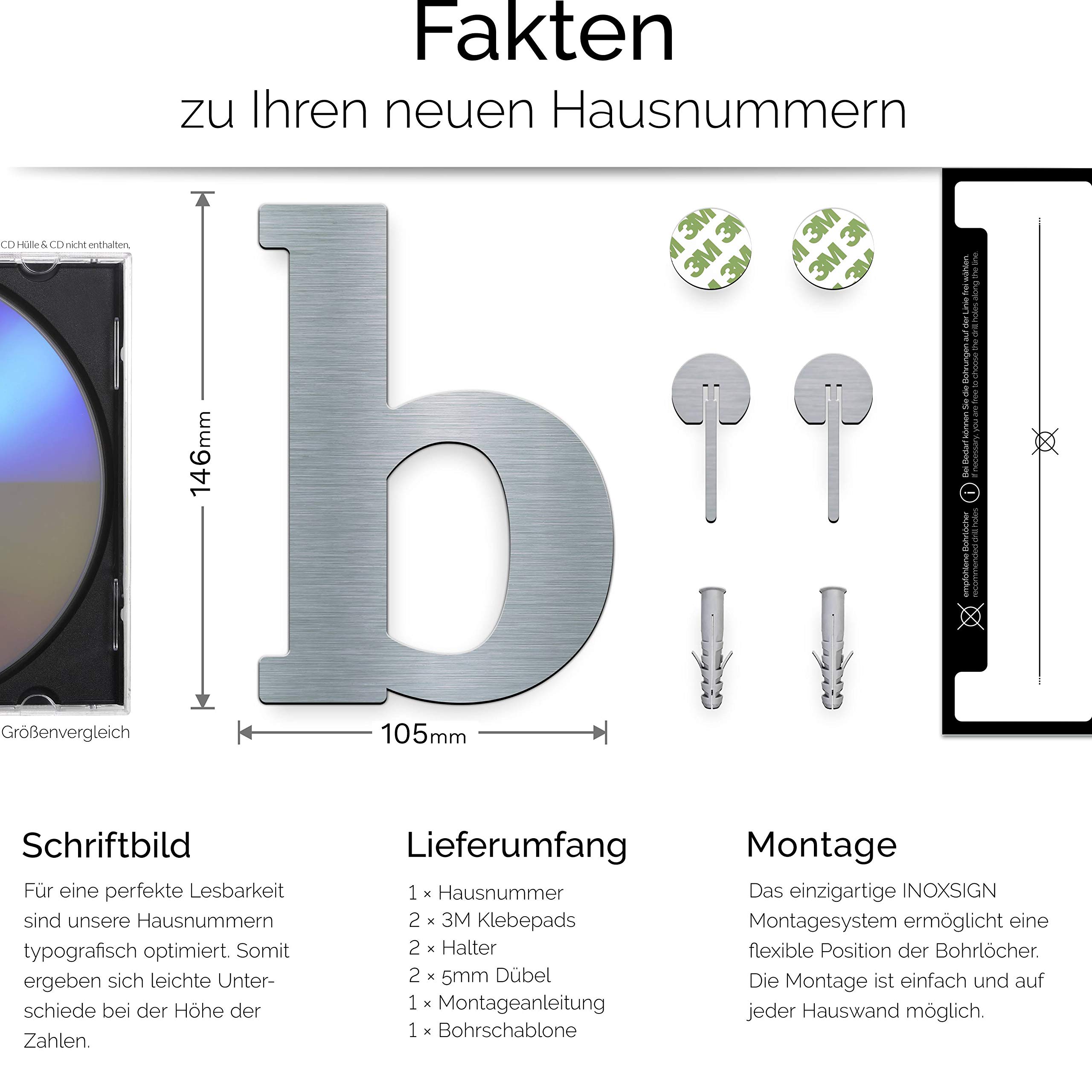 ⭐ FACILE + MONTAGE FLEXIBLE - Nos numéros de maison sont rapidement et facilement assemblés en quelques minutes. Les chiffres et les lettres sont EXTRÊMEMENT STRAPACABLES et résistent aux conditions climatiques les plus rudes. Le montage doit donc être coordonné au mieux avec le mur individuel de la maison. Numéros de maison en inox brossé fabriqués à Lille. Le système de fixation INOXSIGN permet de monter facilement le numéro de maison à une distance de 10 mm. Informations sur le produit : Fabriqué en acier inoxydable brossé d'une épaisseur de 2 mm. Gabarit et instructions de montage Grâce au système de fixation INOXSIGN protégé, le numéro de maison peut être monté de manière flexible. Numéro De Maison En Inox Numéro De Maison 3 - Acier Inox - Résistant Aux Intempéries - Avec Numéro En Inox Pour Maison Une petite ombre entre l'enseigne et le mur de la maison offre un contraste optimal. Montage avec joint creux : Pour une visibilité parfaite du numéro de maison, un contraste fort avec le mur de la maison est logique. ⭐ VISIBILITÉ FACILE - Nos plaques de numéros de rue modernes sont conçues de manière à être PARFAITEMENT LISIBLES même à distance. Tout le matériel de montage est INCLUS. Les plaques numéros de maison en inox apportent une touche de modernité et de visibilité à votre domicile. Résistantes aux intempéries et faciles à entretenir, elles assurent une lecture claire et pérenne de votre adresse, essentiel pour les services de livraison et les secours. Parfaites pour embellir votre entrée sans compromis sur la fonctionnalité ⭐ PREMIÈRE CLASSE QUALITÉ - Nos numéros de maison de haute qualité ainsi que le matériel de montage sont fabriqués en Allemagne. ⭐ SPÉCIFICATIONES - hauteur du numéro de maison : 140 mm, épaisseur du matériau : 1 mm (ECO) ou 2 mm (SOLID) - livraison : 1 numéro de maison (V2A), 2 ancrages de fixation (V2A), 2 chevilles, 2 patins adhésifs, 1 notice de montage, 1 pochoir 🛠 conseil de montage - coller d'abord le pochoir au lieu où vous souhaitez fixer le numéro de maison. Le numéro de maison peut être collé sur des surfaces lisses (par ex. Numéro de la maison avec le chiffre 3; La police du numéro de la maison est Arial; Dans un design moderne en 3D; Les numéros de maison sont en acier... Les forages peuvent être librement choisis le long du contour du numéro de maison. boîtes aux lettres). L'installation à distance du mur de la maison entraîne la formation d'un espace d'ombre et donc d'un contraste. Montage facile grâce au système de montage innovant INOXSIGN Plaque numéro inox thermolaqué | Design personnalisé et durable
