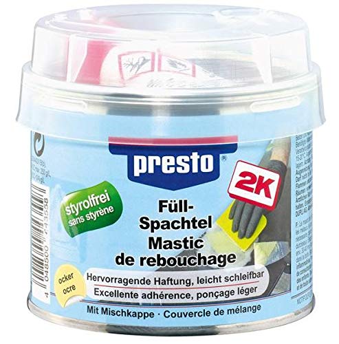 Le composé de remplissage presto sans styrène est un mastic de remplissage en polyester bicomposant constitué d’un mélange de résine de polyester moyennement élastique, hautement réactive, préaccélérée aux amines, avec différents minéraux, et des agents de remplissage respectueux de l’environnement. Mise en œuvre simple les marches d’escalier, l’installation de chevilles et boulons d’ancrage, etc. Mastique Carrosserie Voiture Résine NS Polyester Polyvalente Tous Matériaux Sans Styrène - ING Pate A Bois Durcisseur Styrène Reduit Remplissage - EUR 12,70.À VENDRE! Applicable au métal, au bois, au béton. Pour remplir les trous et les bosses, les spatules couvertes des surfaces réservées lors de la réparation des pièces du... Applicable sur métal, bois et béton. Le mastic de remplissage sans styrène presto est un mastic de remplissage et de reconstruction bicomposant sous forme de mélange d'une résine polyester moyennement élastique, très réactive, pré-accélérée aux amines avec différents agents de remplissage minéraux et respectueux de l'environnement Résiste aux acides faibles, bases, gaz propulseurs, solvants, à l’eau et au sel de déneigement Pour une utilisation universelle dans l’ensemble du secteur des loisirs et du bricolage. Presto Füllspachtel 500 g kaufen bei