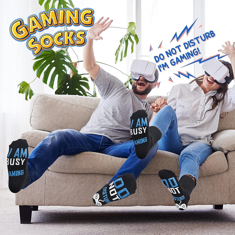Veuillez vérifier les informations de taille de nos chaussettes avant de passer commande. - Convient à la plupart des hommes et des femmes, et peut être porté par des personnes avec des pointures allant du 38 au 42., - Les caoutchoucs antidérapants sur la plante de vos pieds vous protègent contre les chutes et garantissent que chaque pas que vous faites sera stable et sécurisé. Réalisez un maximum de bonnes affaires avec votre produit Chaussettes Humour pas cher : des promos et du cashback à chaque commande sur notre site tout au... Parfait pour les sols en bois et carrelage, il offre un amorti adéquat pour vos pieds sans crainte de bruit. Matériau de haute qualité : cette chaussette cadeau créative est fabriquée à partir d'un mélange de qualité supérieure de 80 % coton, 15 % polyamide et 5 % élasthanne, offrant une douceur, un confort, une élasticité et une respirabilité inégalés. Ils sont un excellent choix pour les femmes enceintes et font des cadeaux prénataux ou post-partum attentionnés pour la fête des mères, Noël, les anniversaires, la Saint-Valentin ou toute autre occasion spéciale. Caractéristiques : Matière : coton, polyester., Taille : taille unique., Couleur : noir. Chaussettes unisexes en coton doux « Do Not Disturb I'm Gaming » - Chaussettes fantaisie amusantes - Cadeau de Noël pour homme et femme, 10 Double Les chaussettes fantaisie sont un cadeau amusant parfait pour toutes les occasions Lavable à la main ou en machine : ces chaussettes cadeaux peuvent être lavées en machine avec des vêtements de couleur similaire, lavées à la main ou autre. Cadeau parfait pour toutes les occasions, en particulier pour la fête des pères, un anniversaire, un anniversaire de mariage, Thanksgiving. Chaussettes Pour Adolescents, Garçons, Enfants, Cadeaux Chaussette Homme Humour Fantaisie Coton Drole Personnalisé Rigolotes Socks Anti-glissant Imprimé Lettres Cadeau Anniversaire Paternité Fête des pères Jeux... Cadeaux de jeu fantaisie : le dessous des chaussettes est imprimé avec le message humoristique « DO NOT DISTUB I'M GAMING », ce qui en fait un cadeau parfait pour les amateurs de jeux pour homme, garçon, adolescent, petit ami, petit ami, fils, mari, papa, ami. Taille unique : taille unique qui convient à la plupart des hommes et des femmes.
