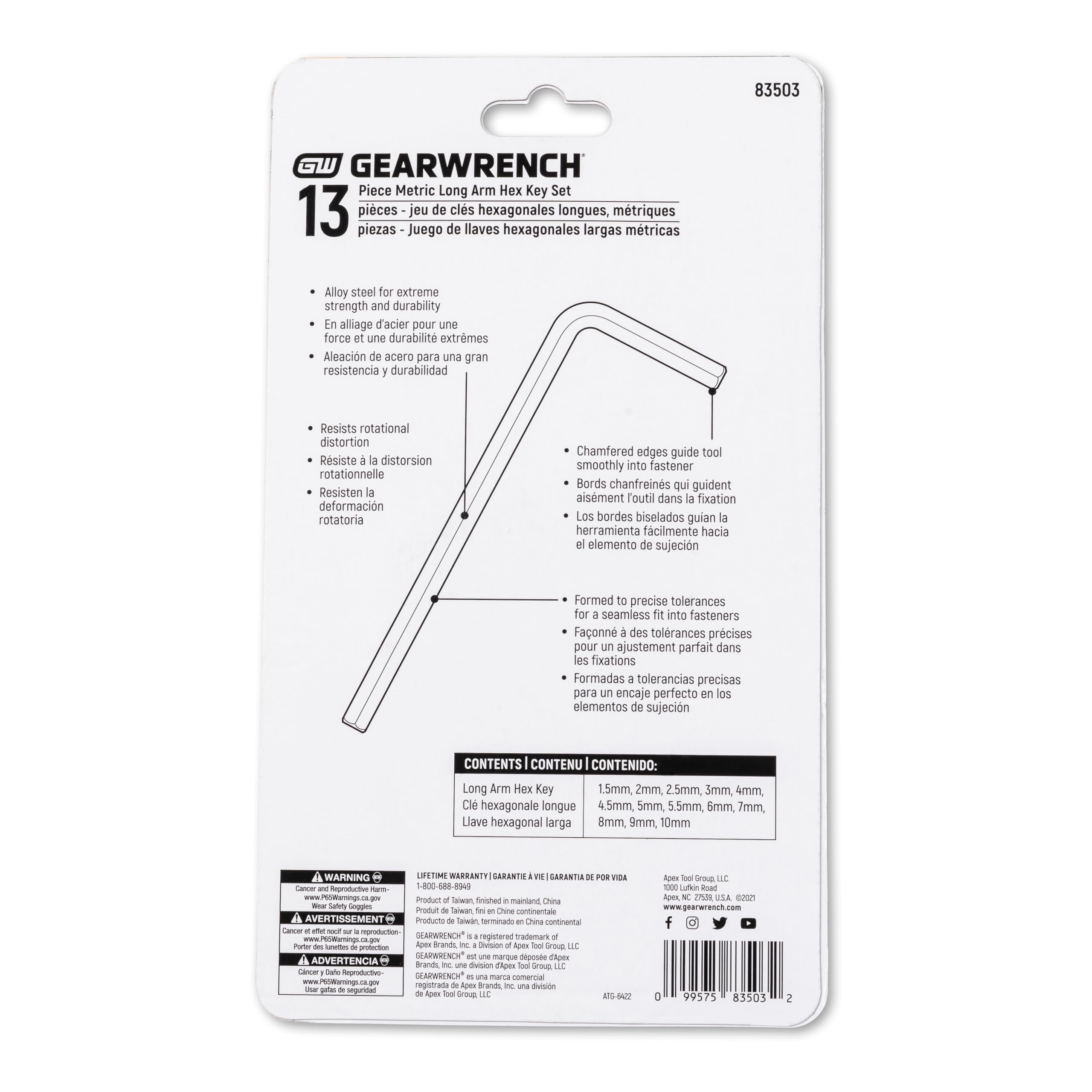 Respecte ou dépasse les normes ASME. Le jeu de clés hexagonales métriques à bras long GearWrench 13 pièces comprend des clés hexagonales fabriquées en acier allié pour ofir une solidité... GEARWRENCH Metric Long Arm Hex Key Set with Caddy (13-Piece) 83503 - The Home De Le côté court ou long peut être utilisé, offrant un meilleur accès et une meilleure vitesse dans toutes les situations Clef A Laine EXPERT E113929 - JEU DE 9 CLÉS MÂLES COURTES HEXAGONALES MÉTRIQUES | Mister Worker Clé Btr Les meilleures offres pour GEARWRENCH 13 Piece Long Arm Metric Hex Key Set - 83503 sont sur Comparez les prix et les spécificités des produits neufs et d 'occasion Pleins d 'articles en livraison gratuite Clés fabriquées en alliage d'acier pour une résistance maximale et pour résister à la distorsion de rotation Les bords chanfreinés aux deux extrémités aident à guider la clé dans la fixation en douceur et rapidement