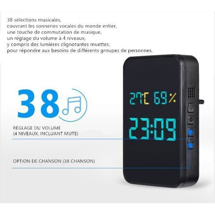 Longue distance de travail: Cette sonnette électronique à haute fréquence sans fil utilise une puce de mise à niveau de quatrième génération avec de fortes caractéristiques anti - interférence, pas besoin de s'inquiéter que le signal soit mal connecté à la porte d'à côté. Vérifiez l'heure à tout moment et le numéro d'appel s'affichera lorsque le bouton de la sonnette sera enfoncé, ce qui permettra de distinguer facilement les portes avant et arrière Design unique sans piles : grâce à la pression du doigt pour générer de l'électricité, de l'énergie cinétique en énergie électrique pour transmettre des signaux sans fil, éliminant le besoin de remplacer les piles 1 Portée des travaux 2 Volume niveau 4 3 Soins Kit de sonnette sans fil: 1 récepteur de sonnette de faible puissance enfichable qui peut afficher l'heure et le numéro de la porte, peut voir l'heure et distinguer les emplacements des visiteurs, 2 émetteurs de sonnette étanches ip68 avec vis et ruban adhésif double face qui peuvent être installés n'importe où pour vous assurer de ne manquer aucun visiteur. Pour changer de sonnerie, appuyez simplement sur le bouton Sonnerie pour sélectionner la sonnerie souhaitée. 1 Sonnette sans fil 2 Méthode d'appariement Julyfox Kit de sonnette sans fil programmable 60-260 V Tension sûre 300 m 52 carillons LED clignotants 2 boutons poussoirs étanches Motif pleine lune Blanc (2 émetteurs 1 récepteur Le silence ouvre également le numéro de porte afin que vous ne manquiez aucun visiteur. Fonction mémoire: le récepteur de sonnette se souvient de la dernière mélodie et du volume après une coupure de courant sans que vous ayez à le réinitialiser. La performance imperméable à l'eau est plus forte, n'a pas peur du vent et de la pluie, convient à l'extérieur, conception à faible consommation d'énergie, pas besoin de changer fréquemment la batterie, convient à la maison et à l'appartement de Villa, au Bureau, à l'école, à l'hôpital, à L'hôtel et à d'autres applications. Carillon Et Sonnette Sans Fil Sonnette étanche Kit De Sonnette Sans Fil étanche, Contrle Longue Kit Carillon Et Sonnette Sans Fil Sonnette extérieure étanche sans fil avec affichage de l'heure par LED... Le volume peut être ajusté en fonction de l'environnement. Bouton de sonnette étanche en silicone intégré: le nouveau bouton de sonnette étanche ip68 amélioré améliore la conception étanche en silicone complète.