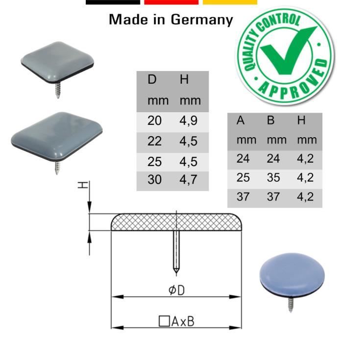 Assurez-vous que la surface est propre et sèche avant l'application Ils sont un accessoire indispensable pour tous ceux qui veulent protéger leurs meubles tout en améliorant leur mobilité. Chaque patin dispose d'un dos autocollant qui permet un montage facile et rapide. Les 24 patins pour meubles en téflon sont le choix parfait pour déplacer des meubles lourds en toute sécurité et protéger vos sols des rayures. Réduction du bruit : ne vous inquiétez plus du bruit dur lorsque vous déplacez les tables ou le canapé. Ils aident à déplacer facilement des meubles lourds tels que des chaises, des tables, des armoires ou des canapés sans endommager vos sols. Patins de meubles en téflon 24 pièces, pieds ... Livraison gratuitePrix total : 16,04 €Délais de livraison : Livrera entre 6 et 10 jour... Ces patins autocollants sont disponibles en forme carrée et ronde et sont parfaits pour les meubles lourds. Avec un total de 24 patins dans le paquet, ces patins pour meubles offrent une quantité suffisante pour plusieurs meubles ou pour avoir des patins de rechange à portée de main. Contenu de la livraison : le paquet contient 12 patins carrés de 20 x 20 mm et 12 patins ronds de 20 mm. Nombreuses utilisations : les patins pour meubles conviennent aux sols lisses tels que le carrelage, le bois dur, le stratifié, pas le béton et autres sols rugueux Il suffit de les coller sur le dessous de vos meubles et de les presser fermement. Laflon Lot De 24 Patins De Meubles En Téflon 24 X 100 Mm Investissez dans ces patins pour meubles et facilitez-vous la vie lorsque vous déplacez et protégez vos meubles. Facile à utiliser : autocollant pour une installation facile. Nombreuses possibilités d'utilisation : ces patins pour meubles sont parfaits pour différentes applications à la maison, au bureau ou dans des environnements commerciaux. metagio Möbelgleiter, 24 Stück PTFE Teflon Quadrat Selbstklebende Möbelschieber Les patins pour meubles sont fabriqués en téflon de qualité supérieure, un matériau robuste qui est particulièrement glissant et garantit une longue durée de vie.