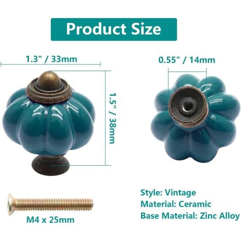 Contenu de l'emballage : Vis dorées ou vis argentées. Poids (vis incluses) : 59,5 g. Matériau : céramique + alliage de zinc. Ils sont fabriqués à partir de matériaux de haute qualité avec des raccords durables et conviennent à toutes sortes d'applications. Utilisez-les pour une armoire, des poignées de commode, des portes d'armoire, une chambre, une cuisine, des meubles de salle de bain, des commodes ou des placards Lot de 12 boutons en céramique ivoire et verte - boutons d'armoire... Bouton De Porte En Céramique OMABETA Poignées De Porte Boutons De Porte Citrouille En Céramique Bouton Pour Porte De Cuisine 8 boutons en céramique en forme de citrouille., 8 vis de 2,2 cm., 8 vis de 2,5 cm., 8 vis de 3 cm. Kurtzy Bouton Ceramique Meuble Blanc et Bronze avec Vis Design vintage en forme de citrouille : les boutons élégants en forme de citrouille sont très vintage, uniques et beaux, ils ont un effet magique dans la décoration Diamètre du bouton : 4 cm. 【Fournit une variété de vis pour répondre à différentes épaisseurs de bois】Trois longueurs de vis couramment utilisées sont fournies : 2,2 cm, 2,5 cm et 3 cm pour répondre à l'épaisseur de la plupart des meubles.