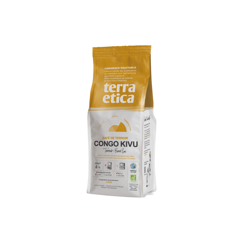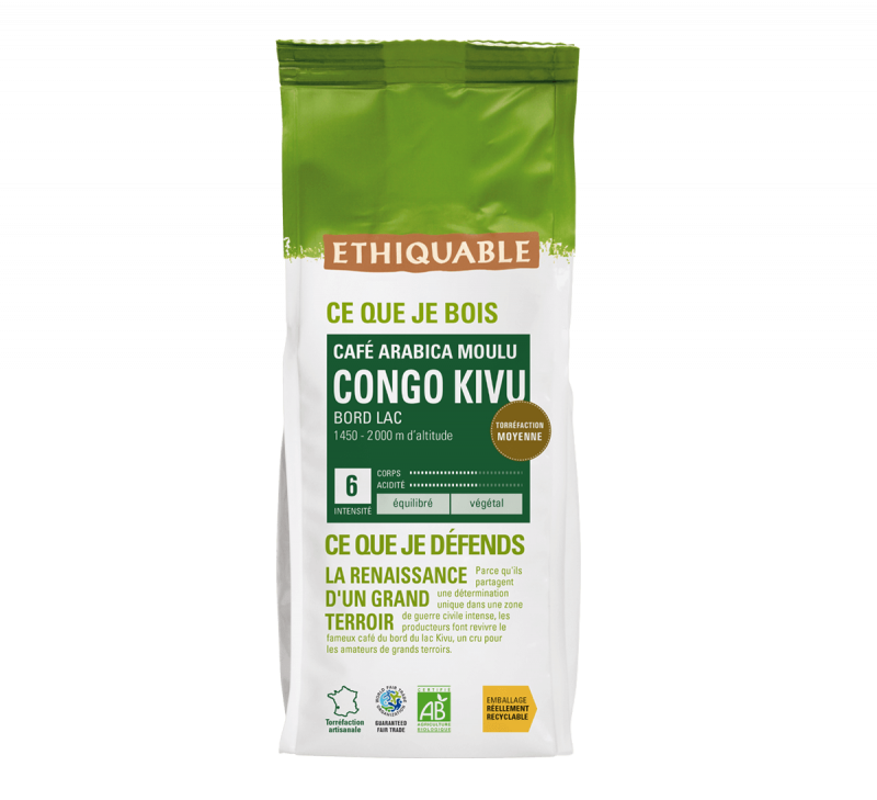 Café moulu du Congo bio & équitable de la marque Ethiquable Les Hauts Plateaux du Kivu accueillent un terroir de café renommé pour ses arômes végétaux. 250 g - 100% Arabica - intensité 3/5 Café En Grains Pur Arabica Congo Bio ETHIQUABLE : le sachet de 500g à Prix Le café moulu Congo Bio et équitable - 250g Ce café torréfié, moulu et issu de l'agriculture bio convient aux cafetières et machines expresso. Le café Congo Artisans du Monde a un goût complexe, énergique et intense à l’acidité fine. Il est corsé avec une belle intensité et un univers animal Ses arômes floraux le placent dans la catégorie des grands arabicas africains comme le Moka Sidamo d'Ethiopie. Café Kivu Congo Café Équateur MOULU Bio & équitable - 250 G | ETHIQUABLE Café Moulu Arabica Une guerre civile quasi-permanente depuis 15 ans n'est pas venue à bout de la vision commune des 3200 petits cultivateurs de la SOPACDI : le café, c'est notre futur. Ce café des Hauts Plateaux du Kivu au Congo est cultivé de 1450 à 2000m. Presque abandonnée, la culture du café a repris ses droits à force de conviction, d'appuis techniques et du soutien de plusieurs entreprises engagées dans le commerce équitable en Europe. 250 g - 100% Arabica - intensité 3/5. Café moulu du Congo bio & équitable de la marque Ethiquable. Les Hauts Plateaux du Kivu accueillent un terroir de café...