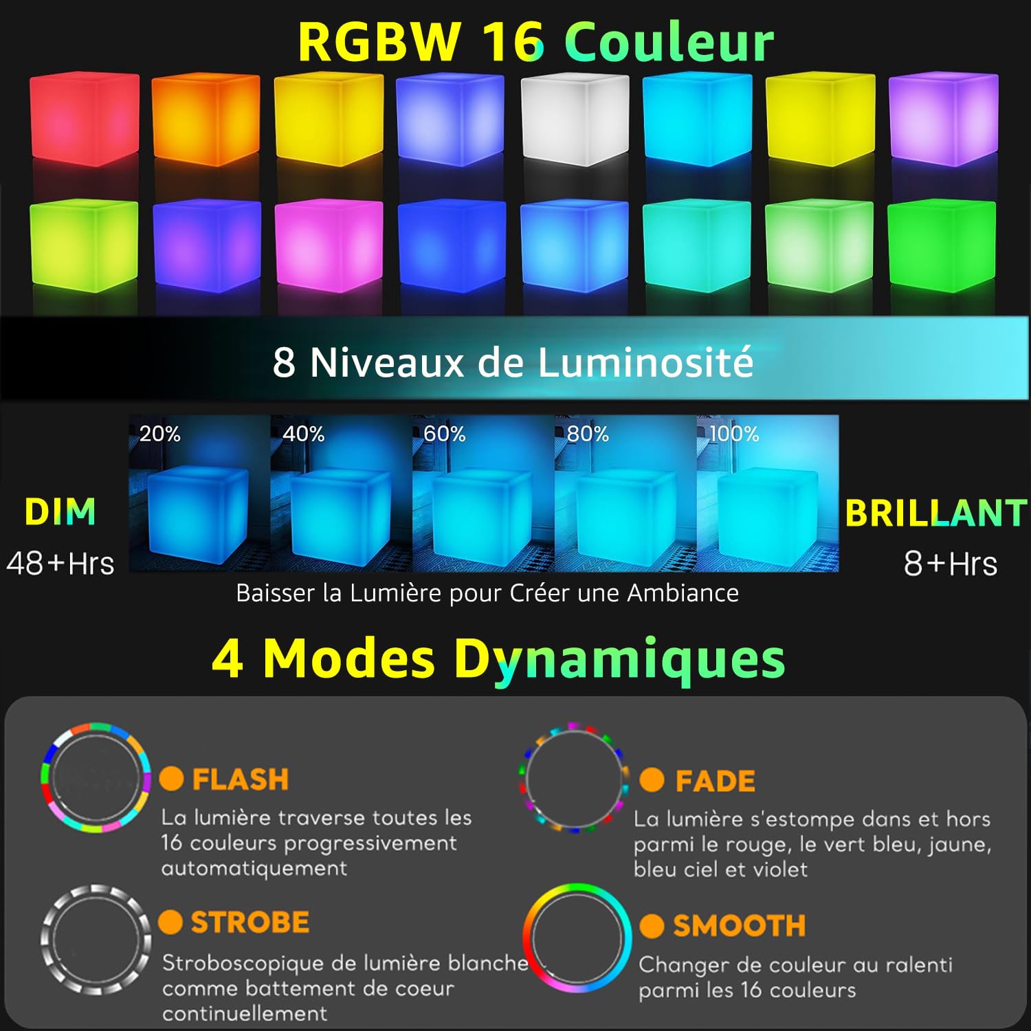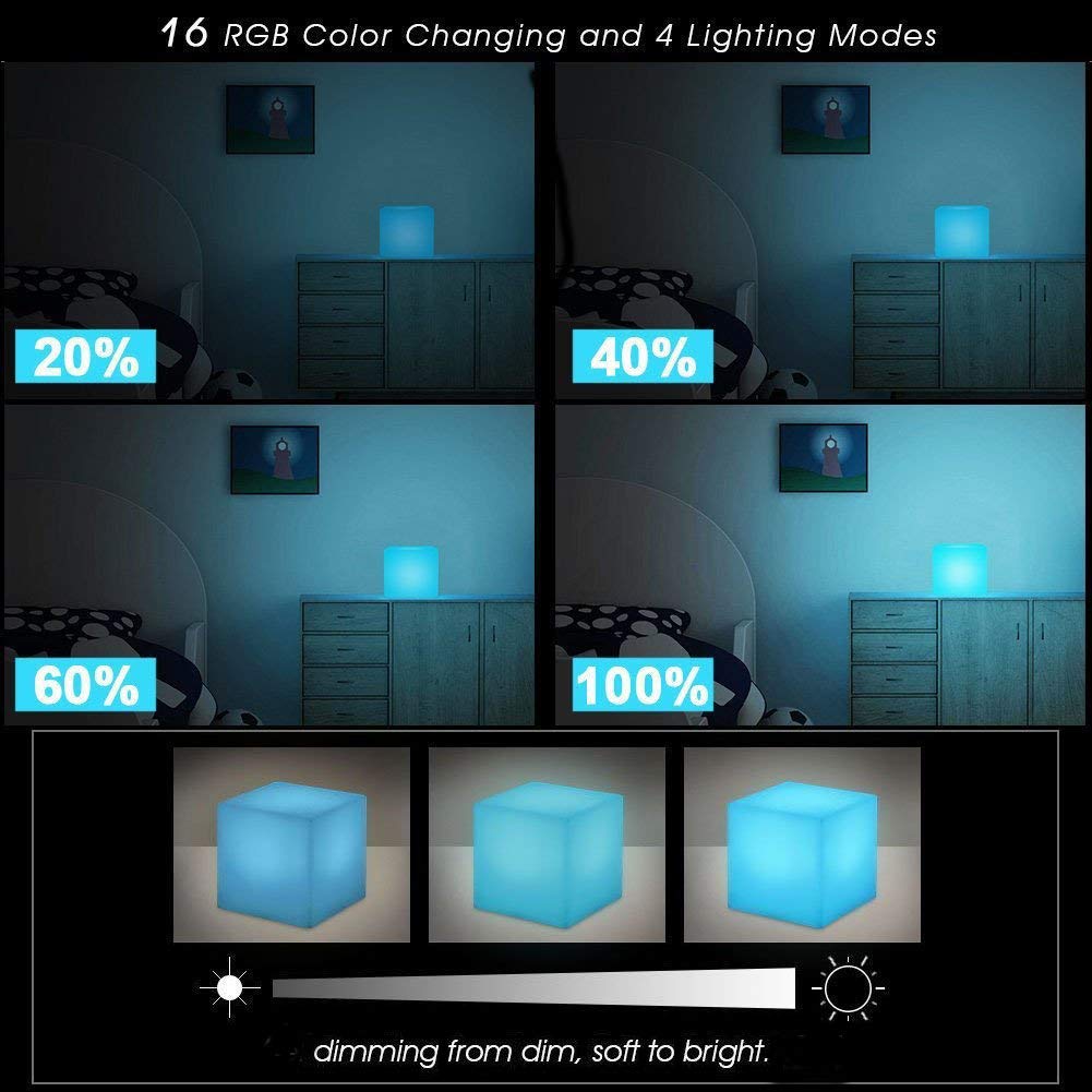 LED Mood Light cube Light 8 niveaux de luminosité et 16 couleurs RGB, lampe de chevet rechargeable USB intérieure et extérieure Spécifications: Matériel: PE Classe imperméable à l'eau: IP65 Tension: DC 3., 7v Batterie au Lithium Polymère: 3., 7v 220mah Nombre de LED: 6 x 5050 RGB + 6 x 3014 WLED Mode lumière: 16 monochrome + 4 modes clignotants Couleurs principales: Rouge, vert, bleu et blanc Temps de charge / travail: 4 - 6 heures / 8 - 10 heures Angle de faisceau: 180 degrés Distance: 8 - 10m L'emballage comprend: 1 x changement de couleur humeur cube lumière 1 x câble USB (chargeur de prise USB non inclus) 1 x télécommande 1 x manuel de l'utilisateur Lape Rubik's cube | Achat | Avant j'étais riche 【lumière d'humeur à distance】La lampe de nuit rechargeable keeda peut être commandée en touchant simplement un bouton au bas de la lampe de chevet et vous pouvez appuyer sur le bouton pour basculer entre les couleurs RGB 16., Utilisez la télécommande pour modifier la couleur, le mode d'éclairage ou le niveau de luminosité. Lampe Couleur Ambiance Éclairage D'Ambiance Lampe-Lampe D’Ambiance,Cube Lumineuse Cube Lumineux Exterieur 【Largement utilisé】LED humeur Night Light peut être utilisé à l'intérieur et à l'extérieur pour toutes sortes d'occasions différentes, telles que la décoration de la maison, bar, KTV, restaurant, piscine, anniversaire, fête de Noël, etc. Lampe Cube Lumineuse Style des Années 70 Lumière Néon vendu par Hater Hulda | SKU 4319886... Keeda Veilleuse cube LED sans fil étanche avec télécommande 【Lampe de nuit dimmable rechargeable】Avec une batterie rechargeable intégrée et une LED RGB haute luminosité, l'éclairage de fête peut fonctionner pendant 8 à 12 heures après une charge complète (4 à 6 heures), avec un câble USB et une charge sans fil, vous permettant d'utiliser l'éclairage de nuit où que vous soyez. 【Luminosité et couleur réglables】16 options de couleurs statiques, niveau de luminosité réglable, 4 modes de changement de couleur (flash, stroboscopique, fade, lisse), vitesse de changement de couleur réglable, vous pouvez choisir la couleur, le mode flash et la luminosité pour s'adapter à votre humeur et créer une atmosphère agréable.
