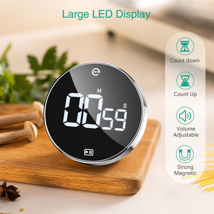 Caractéristiques : Respectueuse de l'environnement. Minuteur de cuisine numérique 24 heures, horloge 12 heures Horloge Murale Numérique - FDIT - CF5135C - Grand Écran LED... Grand écran LCD minuterie de cuisine numérique, facile à lire Synchronisation avec la cuisine, jeux, activités de planification, rappels des délais, et plus de travail. Support pliable, facile à lire et afficher. Il comprend un cadre arrière, un étrier de suspension et un aimant. Le compte à rebours peut être réglé à 24 heures Même si vous êtes dans une autre pièce, le réveil vous frappera. Contenu de l'emballage :1 x LCD numérique minuterie de cuisine Emplacements multiples : magnétique puissant, crochet et support pour répondre à tous vos besoins. Alarme forte et claire lorsque le temps est écoulé, elle continue 30 secondes si vous n'appuyez pas dessus Minuteur Numérique De Cuisine Avec écran Lcd, Volume Alimentation : pile AAA (non inclus)