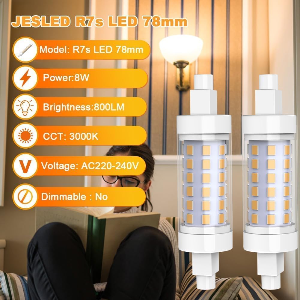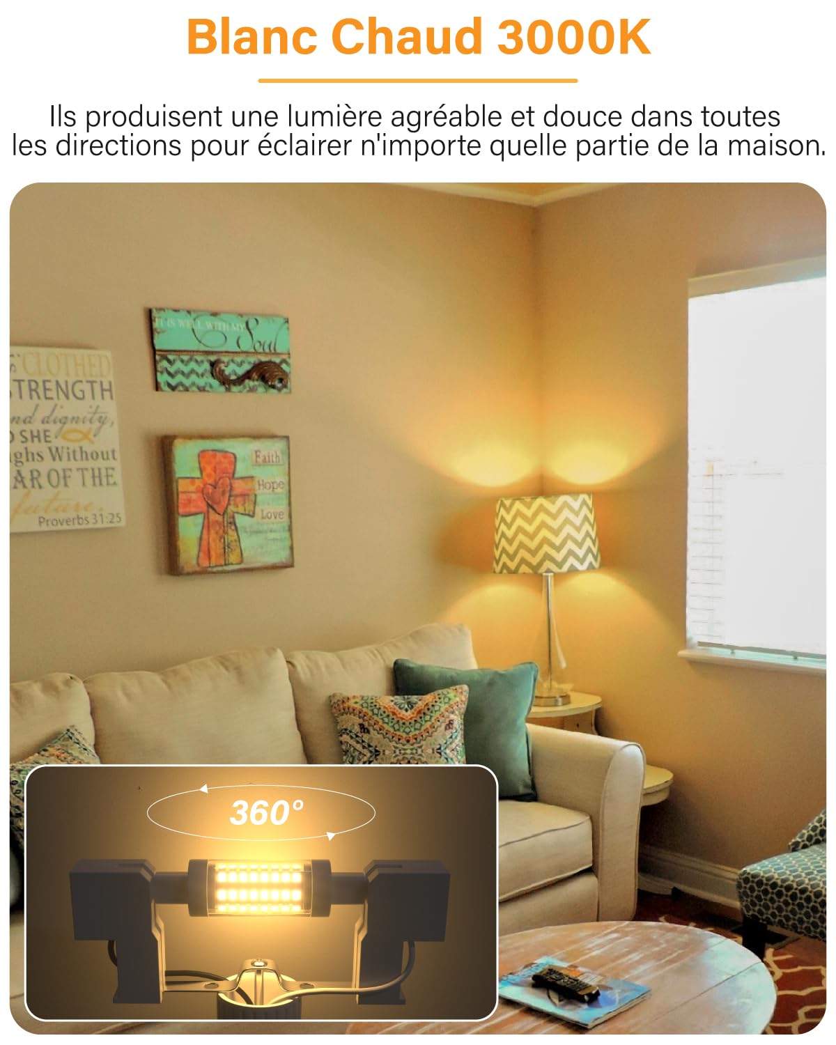 Présentation des produits Taille: Φ 18 * 78mm Puissance: 5W Tension d'entrée: AC 200 - 240V Lumen: 500 LM Couleur claire: blanc chaud 3000k Angle du faisceau: 360 Porte - lampe: r7s Dimmable: No CRI: ≧ 80 ra Économie D'énergie : cette lumière n'est pas réglable, veuillez ne pas l'utiliser avec un variateur. 4 Pièces Applique Murale Interieur/Exterieur 20W Appliques Murales LED... Cette ampoule a une puissance en watts de 5 W, ce qui correspond à une ampoule halogène de 50 W. Pour votre sécurité, éteignez l'alimentation électrique avant d'installer l'ampoule. Blanc Chaud 2700k blanc chaud près de la lumière de la lampe à incandescence, plus de composants rouges, donnant aux gens un sentiment chaud et confortable. L'Ampoule LED doright r7s 78mm 6., 5W n'est pas dimmable et ne doit pas être utilisée avec un Dimmer pour éviter des dommages à l'ampoule. Veuillez vous assurer d'avoir retiré le ballast avant d'utiliser notre lampe LED R7s. Structure Interne La lampe est en céramique avec 64 LED SMD 2835 super lumineuses et un support r7s. R7s 78 Led 15W Equivalent à 150W Halogène R7s Lape Blanc Chaud 3000K... Le ballast réduit la durée de vie. Ampoule R7s EIMOPE R7S LED 78mm 10w Dimmable Ampoule, Ampoules LED R7S 10W Équivalent à Lampe Halogène 80w Ampoule R7s Led Scénario d'application Il peut être utilisé dans une variété de scènes, telles que la Chambre, le parking, le jardin, etc. Nos ampoules r7s peuvent recevoir une tension d'entrée de 200-240V. Longue Durée de Vie : Fabriqué en plastique de haute qualité, il protège l'ampoule LED contre l'oxydation. Assurez - vous que vos informations sont correctes avant de passer la commande. R7s 78 Led 15W Equivalent à 150W Halogène R7s Lape Blanc Chaud 3000K