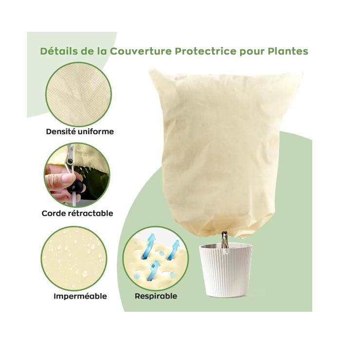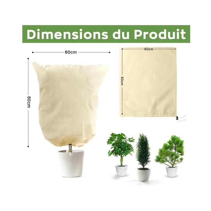 Housse D'hivernage, 100g/m², Plusieurs tailles, Voile d'hivernage pour... Description du Produit 1., le cordon de serrage permet de mieux protéger les plantes. Elle protège les plantes de l'air froid, aide à maintenir une température constante à l'intérieur de la maison et fournit une certaine protection contre le gel, les températures froides et les précipitations froides. DIELOVEHUA Sac Antigel pour Plantes en Pot 45 x 50 cm, Housse Hivernage Plante, Housse de Protection pour Plantes,Protection Hivernale pour Plantes avec Fermeture Éclair et Cordon de Serrage Protection Gel Plantes Exterieur Pot De Protection Pour Plantes D'hiver – 45 X 50 Cm – Housse De Protection Anti-gel Avec Cordon De Serrage Et Fermeture éclair Pour L'hiver, Arbres Fruitiers, Plantes En Pot, Arbustes Housse D Hivernage Économie : Ces sacs de protection isolés pour jardinières ne sont pas seulement efficaces, ils sont également respectueux de l'environnement. Large Application : La taille de 50 x 45 cm convient à la plupart des petites plantes en pot telles que les buissons, les petits/jeunes arbres, les palmiers, les arbustes, les roses, les agrumes, les tomates, les buissons de myrtilles, les paniers de fleurs suspendus et d'autres plantes érigées. Le matériau durable garantit que vos pots de protection contre le froid sont protégés année après année, ce qui permet d'économiser de l'argent et de protéger l'environnement sur le long terme. Lorsque vous n'en avez pas besoin, lavez et séchez complètement les sacs de protection des pots de fleurs avant de les ranger pour la prochaine saison hivernale. Facile à Utiliser : Grâce à son cordon de serrage et à sa fermeture éclair, le sac de protection des plantes pour jardinières peut être installé et retiré sans effort. Housse de protection anti-gel pour pot de fleurs d'hiver, 45 x 55 cm, sac isolant pour plantes en pot avec cordon de serrage et fermeture éclair pour jardin... La fermeture à glissière est facile à enlever ou à mettre, et vous n'avez pas à vous soucier d'être emporté par le vent., 2., Le matériau est doux et respirant, permettant à l'air et à une petite quantité d'humidité de pénétrer dans les plantes pour qu'elles puissent bien pousser dans des conditions froides., 3., lorsque vous n'avez plus besoin de l'utiliser, il vous suffit de laver le thermos plant protector bag et de le ranger pour la saison suivante.