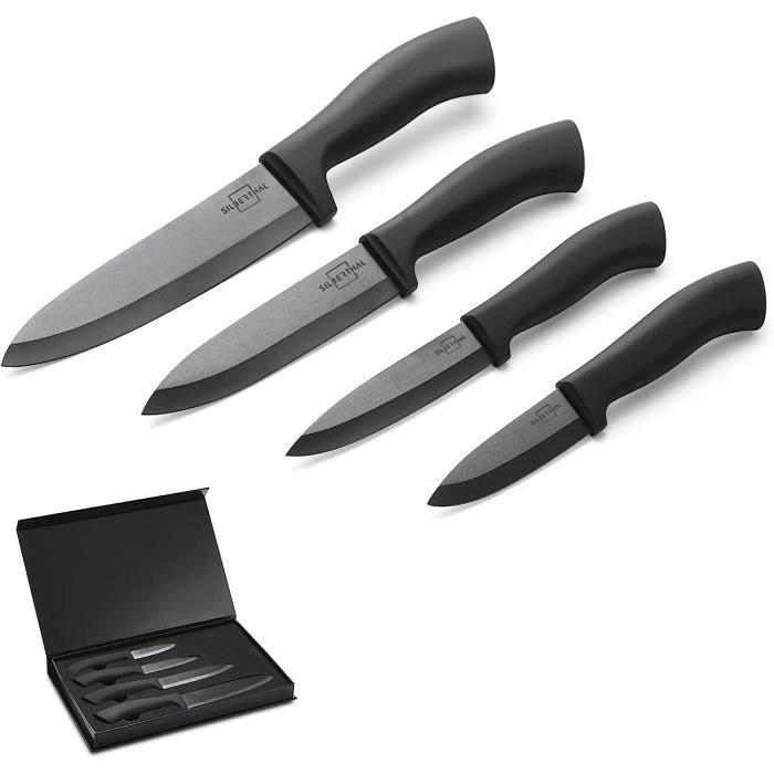 En raison du matériau et de la poignée en plastique, le couteau passe au lave-vaisselle, mais nous vous recommandons de le laver à la main. Les lames en céramique convainquent par leur bonne netteté et longue durée ainsi que leur céramique de haute performance en oxyde de zirconium. La production du matériau est effectuée avec une pression de 300 tonnes, est cuite à 1500 degrés et ensuite soigneusement poncée à la main Le couteau céramique est un couteau doté d'une lame en céramique procurant une coupe exceptionnelle. Dimensions : longueur de la lame : environ 7,5 cm. Les couteaux en céramique sont populaires en raison de leur bon tranchant durable. La céramique est un matériau très dur et donc cassant, de sorte que les couteaux en céramique ne doivent pas être jetés dans un tiroir, mais doivent être stockés protégés mais rapidement accessibles. Les avantages en un coup d'œil : entièrement inoxydable, sans goût et hygiénique, pas de problèmes avec les aliments acides et les fruits, dimensions : longueur env., 16 cm. Longueur totale : environ 16 cm., Poids approximatif : 21 g La surface extrêmement dense et lisse est à la fois inodore et sans goût et hygiénique. Les caractéristiques importantes sont également : passe au lave-vaisselle et inoxydable, sans goût et sans odeur, hygiénique grâce à sa surface extrêmement dense et lisse et hypoallergénique. Coteau Ceramique Orange Et Blanc - Couteau De Cuisine En Céramique, Support Opaque, Utilitaire De Tranchage De Couteau Ceramique Cuisine Farberware Couteau de chef en céraique avec couvercle de lae sur... Couteau Lame Céramique Avis Set De Couteaux Céramique Cadrim - 5 Pièces - Super Tranchants - Antirouille - Pour Légumes/Fruits/Viande Couteaux Ceramique Lot