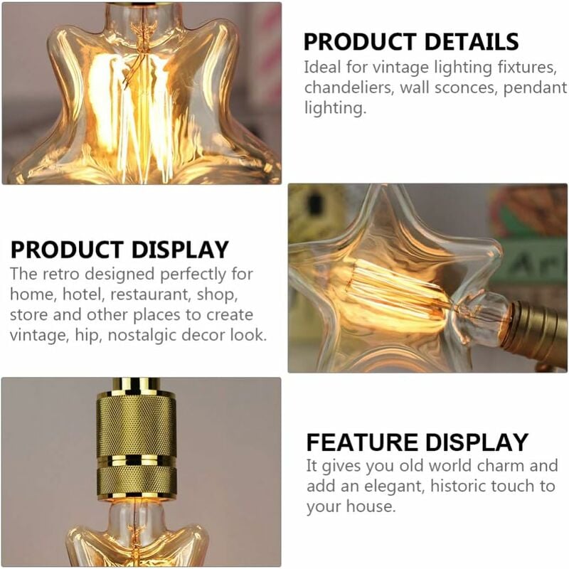 Largement utilisé dans la maison, café, bar, fête, mariage, montres, boutique, etc. Caractéristiques : Culot : E27 LED 3D. La forme sphérique standard à vis moyennes (E27) est facile à installer. Lampe - Veilleuse - Lampe de table chambre - Motifs - Rétro - Pluie Longue durée d'utilisation. G125 3D Light : 125 x 160 mm. Veilleuse,heart 2-220V--Ampoule rétro Edison, Led, Filament amour G125... L'ampoule 3D décorative avec son effet 3D assure une belle lumière et une atmosphère paisible. Contenu de la livraison : 1 ampoule LED 3D pour feux d'artifice. G80 Lampe 3D : 80 x 116 mm. Il créera une atmosphère festive et romantique lorsque vous utilisez ces étonnantes lumières de feu d'artifice 3D pour décorer toutes les occasions festives. Décoration 3D LED Edison ampoule E27 6W 110V 220V Vintage étoile feux d'artifice lampe vacances veilleuse Ampoule lampe à LED éclairage ; Fin : 3... Feu D Artifice Led YWBL-WH Ampoule LED Décorative 3D Effet Feu D'Artifice, Ampoule à Filament 4W De Couleur Pour Décoration Intérieure (577 Ampoule Etoile Tension: AC 85-265V 50/60Hz Puissance: 4W Matériau : cache en verre argenté.