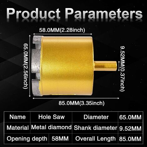 La description:1., Conçu pour percez des trous de 53 mm de diamètre., 2., Le foret de scie cloche nickelé avec un revêtement en poussière de diamant offre des performances et une résistance de coupe supérieures., 3., Coupez des trous nets et ronds à une profondeur d'environ 30 mm., 4., Excellent pour faire des trous propres et précis sur le verre, les carreaux, le marbre et d'autres matériaux fragiles., 5., Utilisez toujours de la lubrification (eau), sinon le foret revêtu de diamant brûlera., 6., Commencez votre trou en diagonale, faites un tracé rond puis maintenez la perceuse droite., 7., Fonctionne mieux avec une perceuse électrique (hors cet article). Scie Cloche Diamant 68 Sourcing Map Foret Scie Cloche Enduit De Diamant De 53 Mm Scie Cloche Diamant 35mm (Doit tre utilis basse vitesse ; utilisez toujours de la lubrification (eau) lors du traitment, sinon la scie cloche br lera.) APPLICATIONS - Parfait pour percez le verre, la céramique, la porcelaine, les carreaux de céramique, les carreaux de porcelaine, le calcaire, l'ardoise, le marbre, la pierre claire et la fibre de verre. REVÊTEMENT DIAMANT - Le revêtement diamant améliore la vitesse de perçage, ce qui rend le foret plus tranchant. Caractéristiques:Nom du produit : scie cloche en verre. TAILLE - Diamètre de perçage de 53 mm (2,1 pouces), diamètre de tige de 10 mm (0,4 pouce). Trépan diamant Ceramic carrelage wolfcraft diam.53mm | Leroy Merlin Matériel: MétalRevêtement du corps : nickelé ; Revêtement de la pointe : plaqué diamantDiamètre de coupe : 53 mm / 2,1 poucesProfondeur de perçage : 30 mm / 1,2 poucesDiamètre de la tige : 10 mm / 0,4 pouceLongueur totale : 55 mm / 2,2 poucesTours par minute : 800-1000Couleur principale : ton argentPoids : 104gContenu de l'emballage : 1 scie cloche pour verre. CONCEPTION SPÉCIALE - Le bord fendu le rend plus net, fonctionne plus efficacement. TAILLE - Diamètre de perçage de 53 mm (2,1 pouces), diamètre de tige de 10 mm (0,4 pouce). REVÊTEMENT DIAMANT - Le revêtement diamant améliore la vitesse de... Achetez VEVOR Trépan Diamant Scie Cloche Foret Diamanté 8Pcs, Kit de Forets Rouges 20/35/40/45/50/68 mm, Trépan Cylindrique Forage à Sec/Humide Filetage M14 pour Meuleuse Carrelage Porcelaine Granit Marbre au prix le plus bas, livraison en 2 jours, retour sous 30 jours. APPLICATIONS - Parfait pour percez le verre, la céramique, la porcelaine, les carreaux de céramique, les carreaux de porcelaine, le calcaire, l'ardoise, le marbre, la pierre claire et la fibre de verre. (Doit être utilisé à basse vitesse ; utilisez toujours de la lubrification (eau) lors du traiter, sinon la scie cloche brûlera