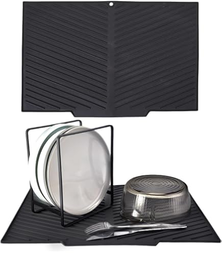 FACILE À ENTRETENIR - Facile à nettoyer, ce tapis égouttoir en silicone se rince facilement avec de l'eau et du savon et est également compatible avec le lave-vaisselle. De plus, après utilisation, vous pouvez rincer ce tapis en silicone avec du savon, de l'eau et une brosse à vaisselle. Ce produit est sans BPA, écologique et antibactérien, et empêche efficacement la prolifération des bactéries Placez le tapis de séchage à côté de l'évier... Les résidus de savon ou de nourriture se rincent facilement du tapis. TAPIS ÉGOUTTOIR EN SILICONE - Fabriqué en silicone durable, offrant une surface douce et protectrice qui empêche les rayures sur votre vaisselle. Également adapté comme tapis de séchage vaisselle ou comme tapis vaisselle dans votre cuisine. Idée créative : vous pouvez utiliser le tapis égouttoir au lieu d'un tapis de séchage comme tapis de léchage pour chien, grâce aux rainures du tapis. Tapis De Cuisine Tapis Égouttoir En Silicone 43,5 X 33,5 Cm En TAPIS EN SILICONE MULTIFONCTIONNEL - En plus de son utilisation comme tapis égouttoir, ce tapis en silicone peut également être utilisé comme tapis de léchage pour chiens. En étalant par exemple du beurre de cacahuète sur le tapis, vous pouvez stimuler votre chien. Parfait pour une utilisation comme égouttoir ou egouttoire vaisselle cuisine. Tapis Egouttoir Dricar Tapis Égouttoir Vaisselle, Tapis Évier Cuisine Super Absorbant, Tapis De Séchage Vaisselle, 40 Tapis Egouttoir Vaisselle, Tapis Vaisselle Antibactérien En Silicone De... Une solution pratique pour votre cuisine, comme tapis égouttoir ou tapis séchage vaisselle. RÉSISTANCE À HAUTE TEMPÉRATURE - Ce tapis en silicone résiste à des températures de -40°C à +120°C, ce qui le rend parfait pour la vaisselle froide et chaude.