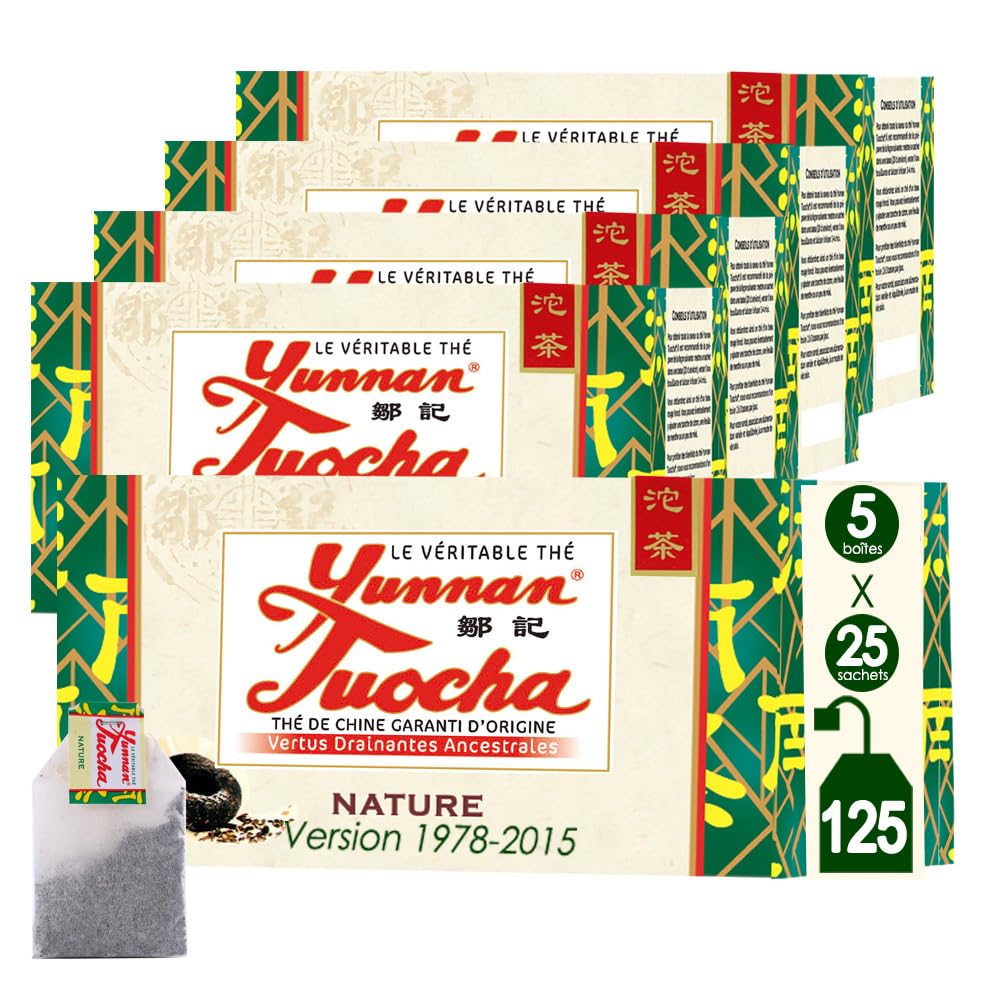 BIENFAITS - dans le cadre d'un régime amincissant pour ses propriétés drainantes, contribue à une bonne hydratation de l'organisme et rafraîchit le corps et l'esprit. 🕰️THÉ DE GARDE SANS DATE LIMITE: Vieillit comme un grand cru, avec un arôme qui se bonifie avec le temps. C’est pourquoi nos produits en ligne n’affichent pas toujours de date limite. Seules les personnes très sensibles (environ 5 %) peuvent ressentir un léger effet., 3., J’ai reçu du thé en poudre dans des sachets, pas du thé en forme de nid. Naturellement décaféiné grâce à un long processus de fermentation, il n’est pas excitant et n’interfère pas avec le sommeil. 🍂SAVEUR UNIQUE ET APAISANTE: Thé longuement vieilli aux notes raffinées de vieux bois, terre humide et sous-bois après la pluie. À conserver dans un endroit sec et à l’abri de la lumière pour préserver toute sa richesse. Un Tuocha bien vieilli développe des arômes caractéristiques de bois ancien, de terre humide ou de sous-bois après la pluie. Ce thé n’est pas mélangé avec du thé vert ou oolong. Sans gluten ni ingrédients artificiels. Bien conservé à l’abri de l’humidité, de la lumière et des odeurs, il peut se garder des décennies. Thé Naturel 100 Sachets Thé Vert Yunnan Tuocha Zouji - 100 Sachets 📈 EFFETS PROUVÉS SUR LA SANTÉ: Des études en Europe et en Asie ont confirmé ses bienfaits sur la réduction du cholestérol et des lipides sanguins, avec des effets comparables à ceux des statines. Beaucoup y trouvent un vrai plaisir, presque addictif ! Vieillissement naturel Ils subissent ensuite une triple fermentation qui donne au thé sa couleur brun foncé et son goût fumé caractéristique. Découvrez le Thé Tuocha au Ginseng Mont Asie sur Le Marché d'Asie ! Cette infusion une invitation à l'équilibre et à la vitalité. Cette tisane harmonieuse entre les feuilles de thé Tuocha et le ginseng offre une expérience sensorielle et bien-être inégalée. Originaire des sommets enneigés du Yunnan, en Chine, le Thé Tuocha est apprécié depuis des siècles pour ses arômes... Pour vous offrir la même qualité dans un format pratique, nous avons simplement broyé le thé à partir des mêmes feuilles entières haut de gamme. Grâce à ce procédé innovant, les arômes et bienfaits se libèrent en 3 à 4 minutes. Est-ce normal? Oui, ce produit est notre version en sachet du Tuocha. 🌿 THÉ TUOCHA NATUREL : Issu des arbres anciens du Yunnan, âgés de 700 ans et cultivés dans les six grandes régions de thé du Yunnan, notre thé sauvage est cueilli à la main, sans pesticides ni engrais chimiques. Ginseng Rouge Thé Noir Bio Tuocha Ginseng En Sachets - Plant'asia Sachet Thé Une infusion réconfortante à savourer. Si vous débutez avec le Tuocha, essayez-le avec un peu de citron, de miel ou même une touche de lait - des idées partagées par nos fidèles amateurs. Même si ces senteurs peuvent surprendre au début, le goût reste doux, velouté et réconfortant. Description du produit Origine Yunnan Le thé Tuocha du Yunnan tire ses bienfaits d’une terre éloignée et isolée dans le sud de la Chine - la province du Yunnan. Yunnan Tuocha (Zouji Tuocha) - A commencé à vendre du thé en France en 1978.Yunnan Tuocha,le thé aux vertus millénaires qui rafraichtt le corps et l'esprit. N'hésitez pas à ajuster la quantité d'eau selon votre préférence pour la force du thé.