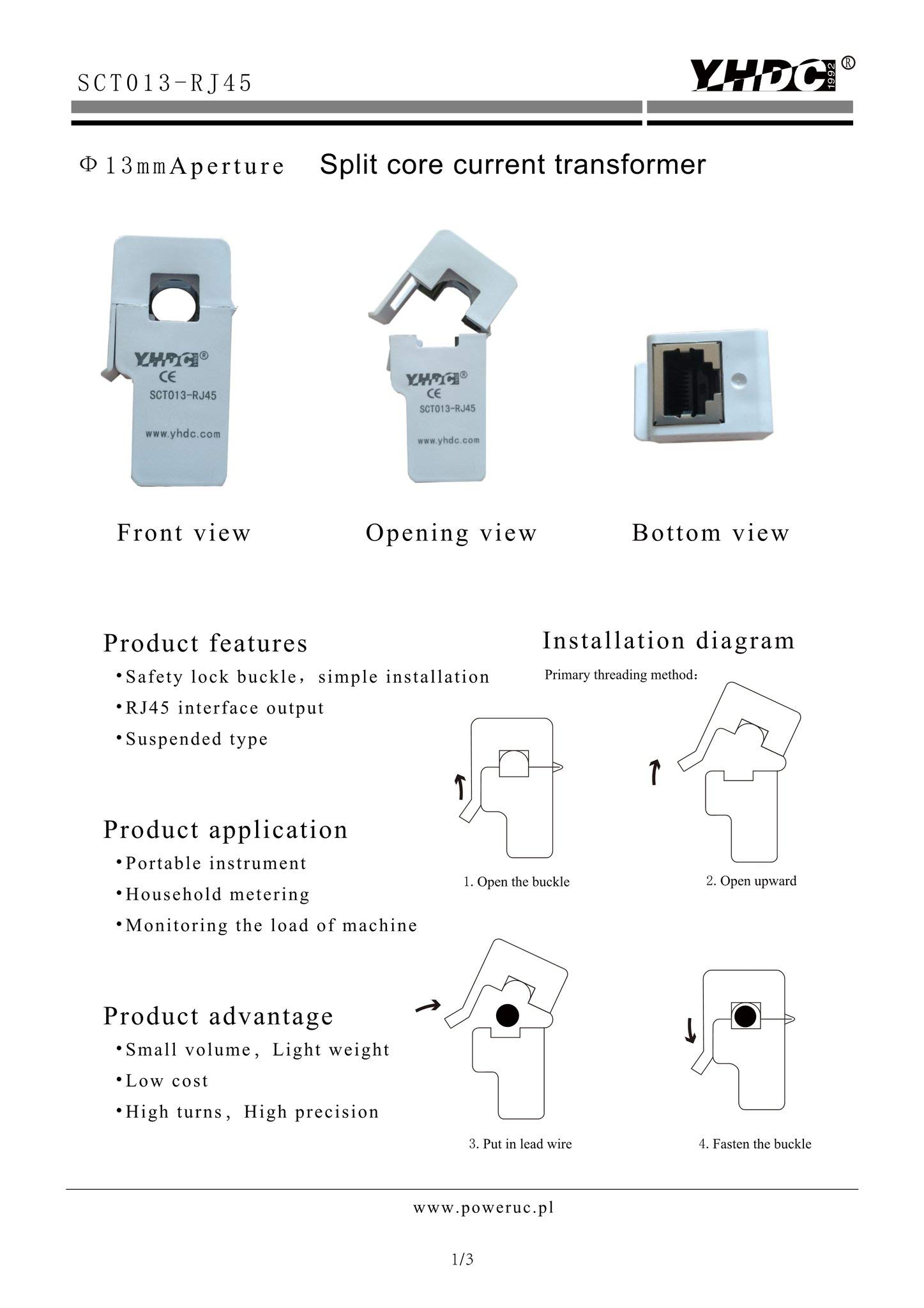 Through core type precision current transformer Model: TA17L-03 Characteristics: Both PCB welding and leading wire output mode are available. Technical data: Rated input: 0-10A Rated output: 0-10 mA Turns ratio: 1:1000 Accuracy: ±1 % Linearity: ≤0., 2% Fire resistance property: UL94-V0 Mounting type:Suspension Material of core: Nanocrystalline Standard:GB1208-2006 Work temperature: -35℃~+85℃ Storage temperature: -45℃~+95℃ Frequency range: 20Hz-20KHz Dielectric strength: ≥3., 5KV 50Hz 1min Phase difference: ≤20’ Max: Sampling resistance: 300Ω Weight: 19., 1 g <b>Through core type precision current transformer</b> <br> <b>Model: TA17L-03</b> <br><br>Rated input: 0-10A <br>Rated output: 0-10 mA <br>Turns ratio: 1:1000 YHDC Transformador de corriente de alta Precision Transformateur de précision du courant <br>Modèle : TA17L-03. <br><br>Entrée nominale : 0-10 A. <br>Sortie nominale : 0-10 mA. <br>Vitesse de rotation : 1 YHDC Through Core Type Precision Current Transformer TA17L-03 <br>Accuracy: ±1 % <br>Linearity: ≤0., 2% <br>Fire resistance property: UL94-V0 <br>Mounting type:Suspension <br>Material of core: Nanocrystalline