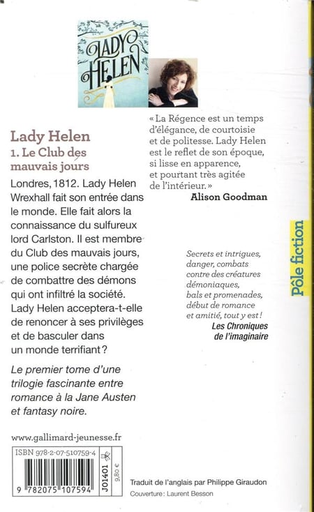 Lady Helen Wrexhall s’apprête à faire son entrée dans le monde. Bientôt, elle sera prise dans le tourbillon des bals avec l'espoir de faire un beau mariage. Mais une bonne de la maison disparait, des meurtres sanglants sont commis, la plongeant soudain dans les ombres de la Régence Description de l'éditeur Découvrez dans cet article 5 raisons de lire Le club des mauvais jours, le premier tome de la trilogie Lady Helen d'Alison Goodman. Lady Helen . 1. Le Club des mauvais jours . Londres, 1812. Lady Helen Wrexhall fait son entrée dans le monde. Elle fait alors la connaissance du sulfureux... Lady Helen Tome 1 LADY HELEN, TOME 1 : LE CLUB DES MAUVAIS JOURS D’ALISON GOODMAN ( 2022) | COmité DE Lady Helen Avis Livre : Le club des mauvais jours, Lady Helen,, le livre de Alison Goodman - Gallimard-Jeunesse - 9782075213226