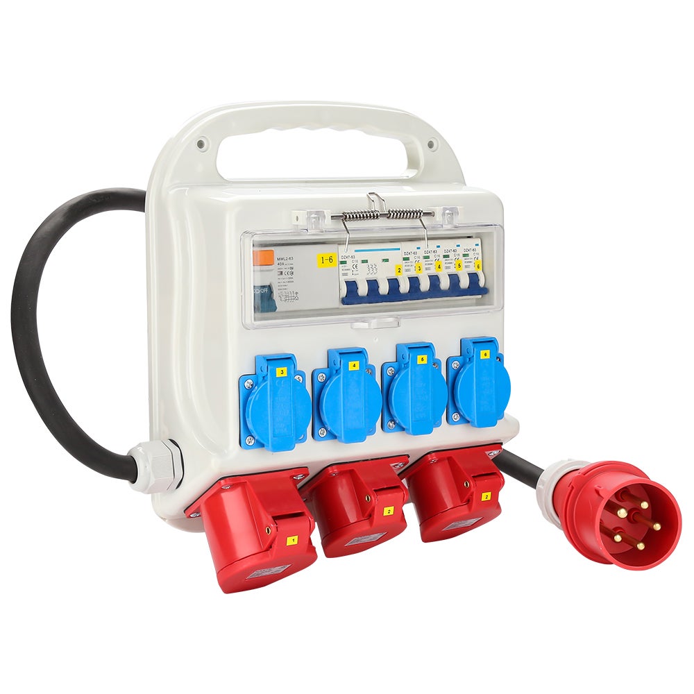 Matériaux de qualité supérieure : nos boîtes de distribution sont fabriquées en nylon, cuivre et ABS, avec des coques robustes qui résistent à la rouille et à l'humidité., Avec RCCB. Triphasé Jopassy Répartiteur De Courant De Chantier CEE 2 X 16 A 400 V 4 X 230 V 5 Broches IP44 Schuko Distributeur De Courant Mural Avec Couvercles De Sécurité Pour Chantier Coffret Chantier Avec ou sans câble en caoutchouc : oui Poids du produit : 8 kg Dimensions du produit : 360 x 280 x 110 mm Caractéristiques : Câble en caoutchouc très résistant. Répartiteur mural 2 x CEE 400 V/16 A 4 x 230 V Schuko IP44 5 broches Répartiteur de chantier 32 A avec couvercle à rabat sécurisé avec interrupteur RCCB, avec... Paramètres techniques : Matériau : nylon cuivre ABS Embrayage : 400 V/32 A 5 broches Degré d'étanchéité : IP44 Données de commutation : oui Avec ou sans interrupteur d'air (RCCB) : oui. Notre distributeur de courant garantit que vous avez toujours une alimentation fiable sur les chantiers, lors d'événements et dans différentes applications. Le boîtier robuste garantit une fiabilité maximale. Notre distributeur de courant mobile est maniable et facile à transporter, idéal pour les chantiers de construction et les événements, ainsi que pour une utilisation dans les zones résidentielles, les jardins et les environnements industriels. Le distributeur d'alimentation est équipé d'un boîtier et d'une poignée robustes. Étanche : indice d'étanchéité IP44., Le boîtier en plastique robuste avec charnières de sécurité empêche les fuites d'eau, de poussière et de saleté et est donc idéal pour l'extérieur. Paramètres : entrée et sortie : coupleur CEE 400 V/32 A 5 broches avec câble, 4 prises de contact de protection 230 V/16 A, 2 prises CEE 400 V/16 A 5 broches, 1 CEE 400 V/32 A 5 broches ; câble en caoutchouc très résistant pour l'alimentation électrique pour pour répondre à vos besoins en électricité. Site Box Repartidor distribuidor de corriente para obra 2 x CEE 400V... En outre, les prises Schuko sont protégées individuellement avec un disjoncteur automatique 16 A et les prises CEE 400 V-16 A. Ce distributeur mobile compact convient aussi bien pour l'intérieur que pour l'extérieur, comme par exemple les chantiers, les maisons, les cours, l'industrie, l'artisanat, les jardins et ainsi de suite. Nous vous proposons un choix varié d y compris disjoncteur différentiel et disjoncteur de puissance. Les sorties sont sécurisées avec le disjoncteur d'erreur intégré. Que les prises 400 V/32 A sont directement connectées au RCCB et ne fournissent donc pas de protection séparée contre les surcharges. Jopassy Répartiteur de courant de chantier CEE 2 x 16 A 400 V 4