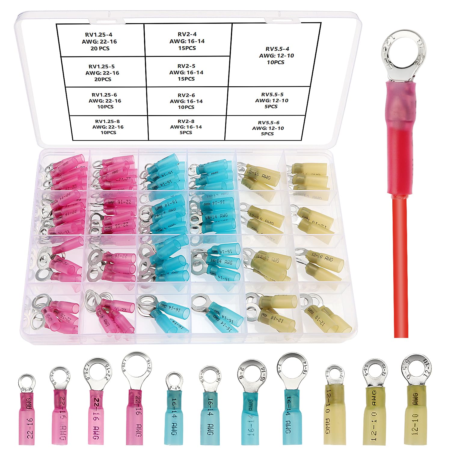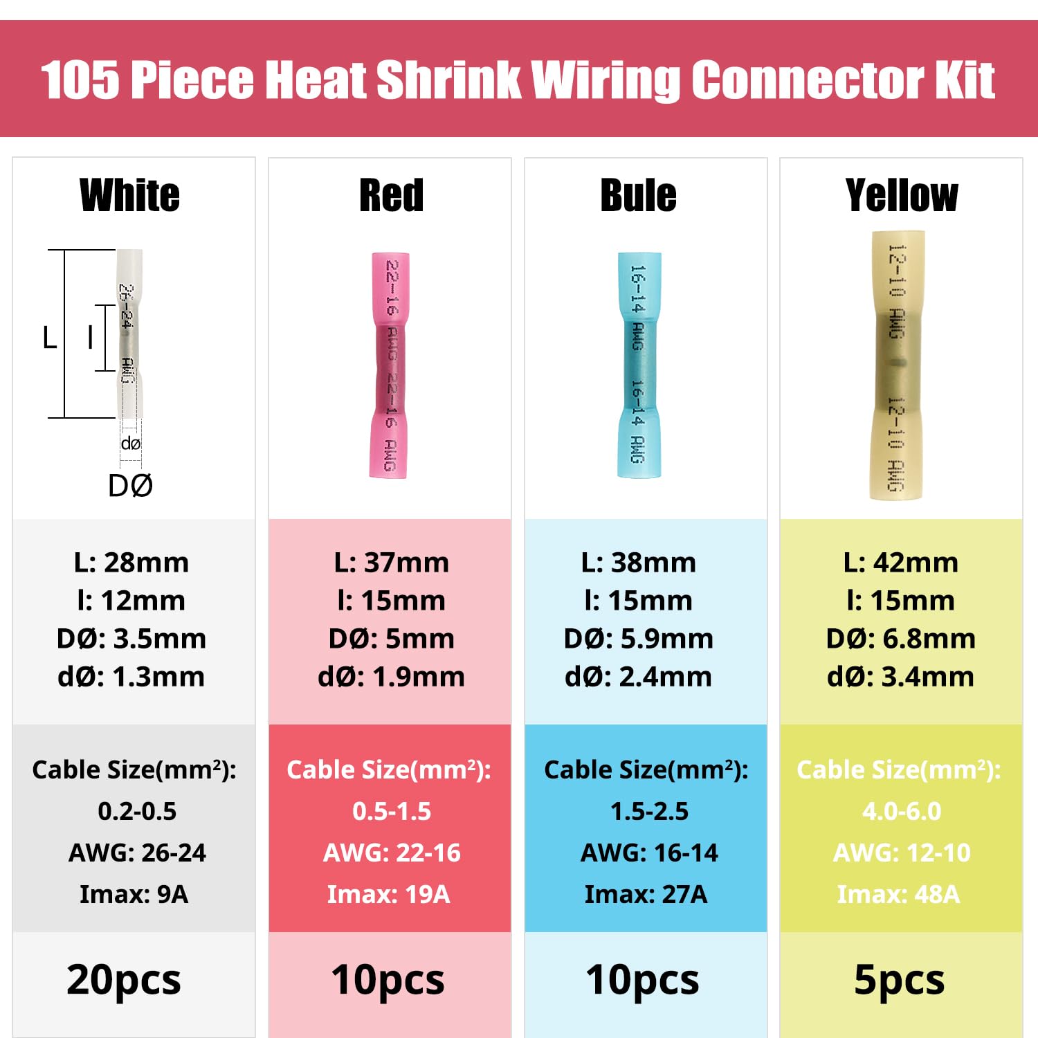 Spécifications : Matériau : Adhésif thermofusible+Cuivre Couleur : Rouge, Bleu, Jaune Température qui commence à diminuer : 80℃ Température de rétrécissement complet : 130 ˚C Température de fonctionnement : -55°C à 125°C Forfait inclus : 60 × connecteurs à bague thermorétractable rouge : section de câble 0., 5-1., 5 mm² (A., W., G. Facile à utiliser: bande d’isolation du fil, sertir le cylindre terminal avec un serrement de fil et chauffez-le avec un pistolet thermique, maintenez-le en rotation pour qu’il chauffe uniformément. Rouge 60 pièces, bleu 45 pièces, jaune 20 pièces. Raccord Electrique Etanche Yosawo 265 Pièces De Connecteurs De Fil Thermorétractables Kit De Scotch Electricien YIXISI 125 Pièces Connecteurs de Fil thermorétractable Kit, Cosses Electriques à Sertir Thermorétractables, Connecteurs à Sertir Isolés Zerone Kit de cosses de fil de cuivre 120 pièces cosses de fil de... 22-16) 45 × connecteurs à bague thermorétractable bleue : section de câble 1., 5-2., 5 mm² (A., W., G. Gamme de fil Rouge 22-16 AWG, Bleu 16-14 AWG, Jaune 12-10 AWG. Facile utiliser bande d isolation du fil, sertir le cylindre terminal avec un serrement de fil et chauffez-le avec un pistolet thermique, maintenez-le en rotation pour qu il chauffe uniform ment Applications étendues: Les connecteurs thermorétractables sont utilisés pour les motos, l’automobile, les VTT marins et d’autres applications domestiques. Matériau premium: Fait d’adhésif thermorétractable de haute qualité + cuivre. 150pcs Connecteur Bout à Bout de Fil Thermorétractable, Cosses