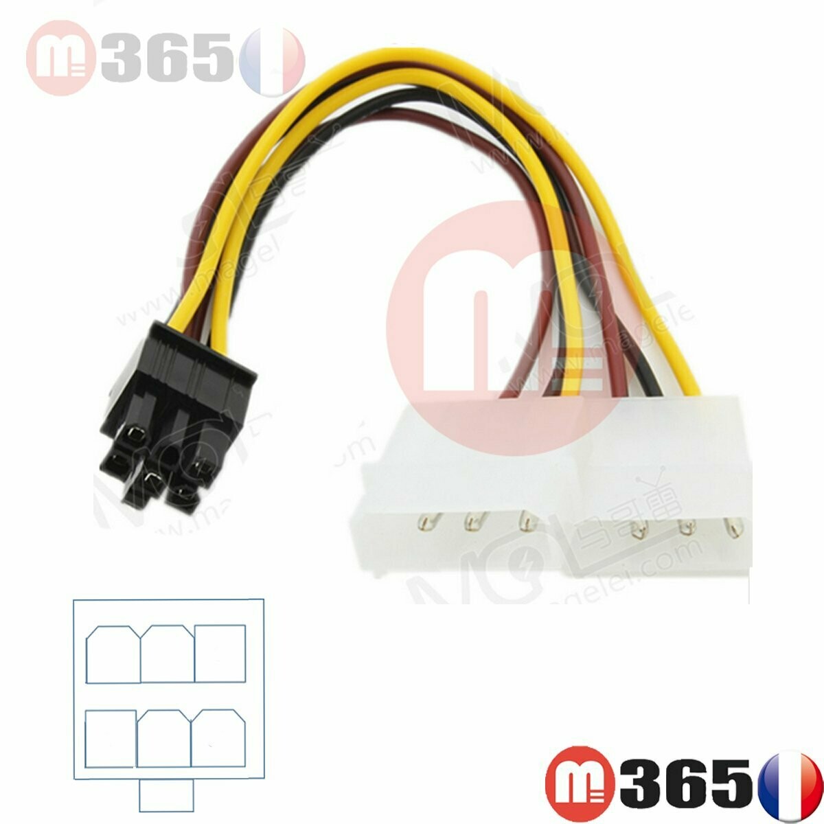 Molex 6 pin dans câbles et adaptateurs internes pour Idéal pour les alimentations dépourvues de prises d’alimentation pour cartes graphiques PCI-Express, cet adaptateur permet d’obtenir une prise de type 6 pins à partir deux prises Molex ide classique.ETAT : neuf. LONGUEUR: environs 18cm Optimisez votre carte graphique avec des câbles spécifiques comme le Câble 6Pin à 4 IDE, parfaitement compatible avec les modèles RM1000X et RM850X. Pour ceux qui recherchent une solution de connexion simple, le Splitter 15cm vous permet de brancher plusieurs dispositifs en un clin d'œil expédier par défaut. Longueur du câble : 17 cm au total, 13 cm entre les connecteurs. Caractéristiques Un connecteur blanc à 4 broches avec broches mâles. Un connecteur PCI... Adaptateur Carte Graphique Cable Matters Lot De 2 Câbles D'alimentation PCIe 6 Broches Vers Molex 15,2 Cm, 2 Molex Vers PCIe 6 Broches Adaptateur Pcie 6 Pins Idéal pour les alimentations dépourvues de prises d'alimentation pour cartes graphiques PCI-E. la couleur de la prise est noir ou blanc .