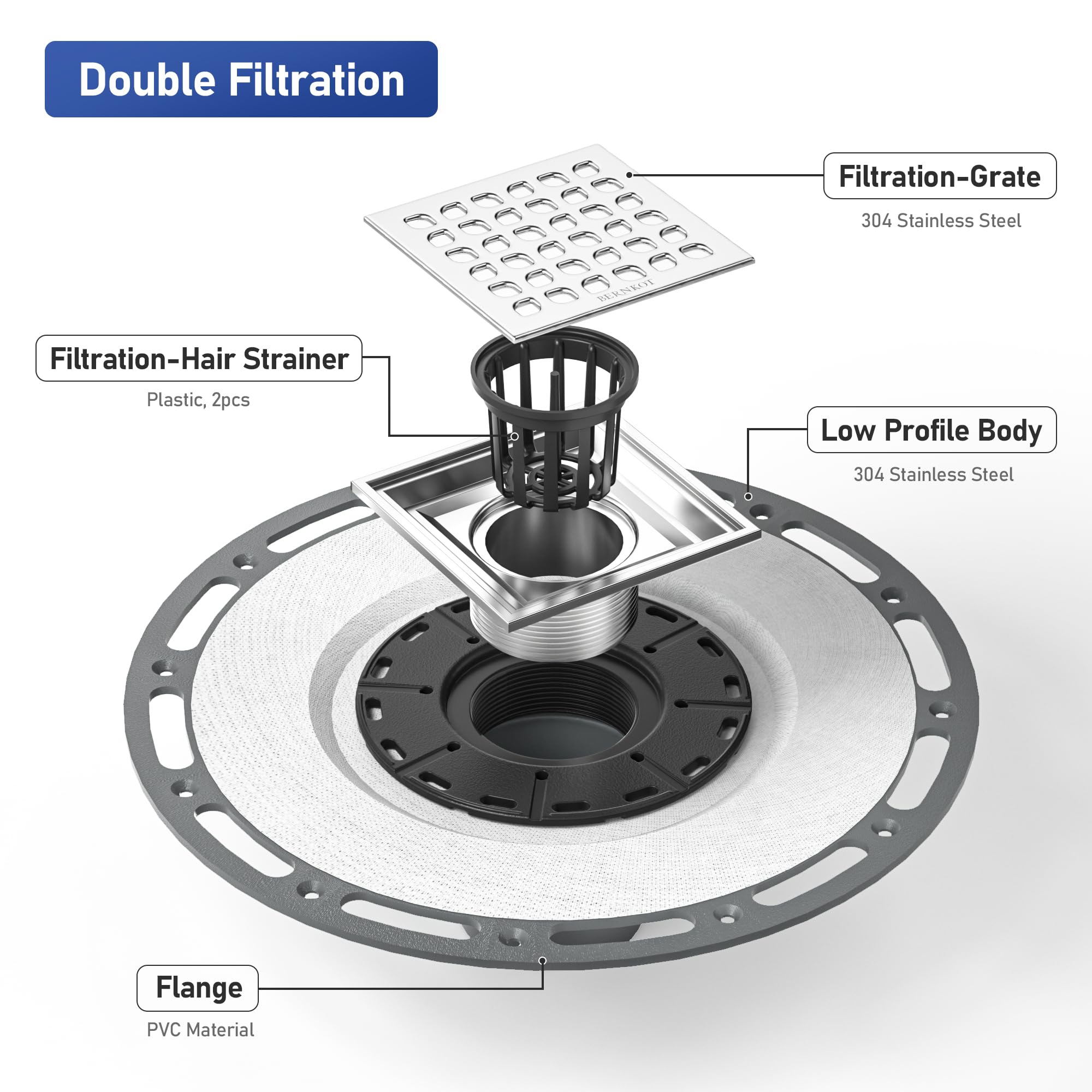 Bernkot Bonde de douche carrée 10,2 cm brossé avec bride de liaison en PVC. Anneau de réglage latéral en ABS : s'adapte à une épaisseur de carrelage de 1,2 cm à 3,8 cm. Design incliné au lieu de plat pour une pénétration facile de l'eau. Un joint torique en caoutchouc est fixé à la base pour assurer une étanchéité parfaite du siphon de douche, évitant ainsi tout glissement et les fuites d'eau Le drain carré de 10,2 cm de long, 10,2 cm de large s'adapte parfaitement à la plupart des carreaux carrés. · Fabriqué en acier inoxydable SUS304 robuste et... Bernkot Bonde De Douche Carrée De 10,2 Cm En Acier Inoxydable Base de bride de liaison en PVC : la surface de la bride est recouverte de tissu. Bonde de douche horizontale grille EQUATION Avec son corps de vidange en forme de V, ce drain de douche coule efficacement. Se fixe aux conduites d'évacuation de 5,1 cm et 7,6 cm. Polyvalence : ce drain de douche peut être installé en conjonction avec un lit de mortier incliné ou des plateaux en mousse préfabriqués.