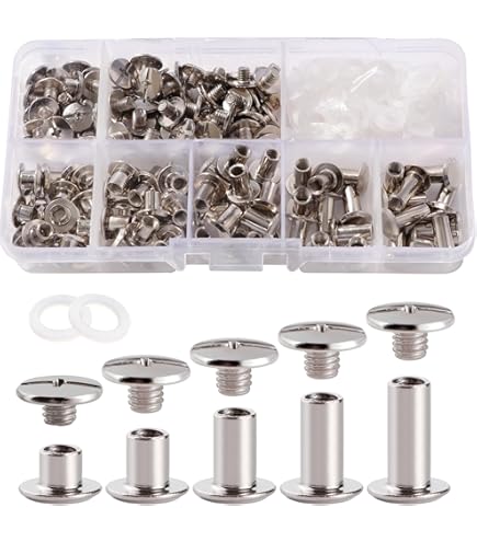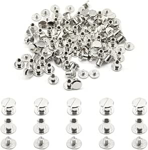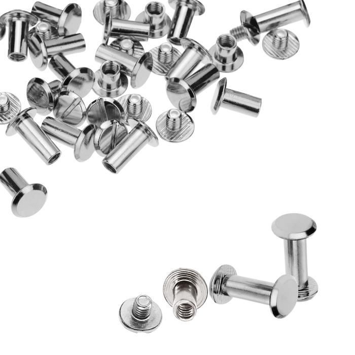 Rivets métalliques à tête plate de haute qualité pour boulons d'assemblage en cuir Description : Matériau : les vis Chicago sont fabriquées en métal de haute qualité, solide et durable pour une utilisation à long terme. 【Emballage】 Quantité : 50 vis Chicago + 50 vis supérieures., Couleur : argenté 80 Set Chicago Binding Schrauben Messing Bindeschrauben Bindungsschrauben, 8 Größen Nagelnieten Diamètre de la tige : 4 mm - Vis : 3 x 6 mm. Épaisseur de cuir conseillée : entre 6 et 8 mm maxi. Conditionnement : lot de 5 ou de 50. Montage facile... Matériau : les vis Chicago sont fabriquées en métal durable, solide et résistant à l'usure, bonne fixation. Hocansen Lot De 50 Vis Chicago M5 X 5 Mm Pour Cuir, Rivets à Clous Chicago, Boulons Chicago, Boulons De Reliure En Métal, Vis à Tige Ronde à Tête Plate Pour Artisanat Taille : vis Chicago : M5 x 25 mm, vis supérieures : M4 x 5 mm., Couleur : argenté. Utilisation : - Ces rivets en cuir peuvent être utilisés pour le traitement du cuir, la reliure, le remplacement des pièces rivetées endommagées, pour la fixation et la décoration, comme un accent parfait pour vos sacs en cuir, ceintures, chapeaux. Quantité : 100 pièces (50 ensembles). MABAHON Lot De 50 Rivets En Cuir Chicago - Vis En Métal M5 X 4 Mm Matériau : laiton ; diamètre de la tête de la vis et de la tige : 10 mm ; diamètre de la vis...