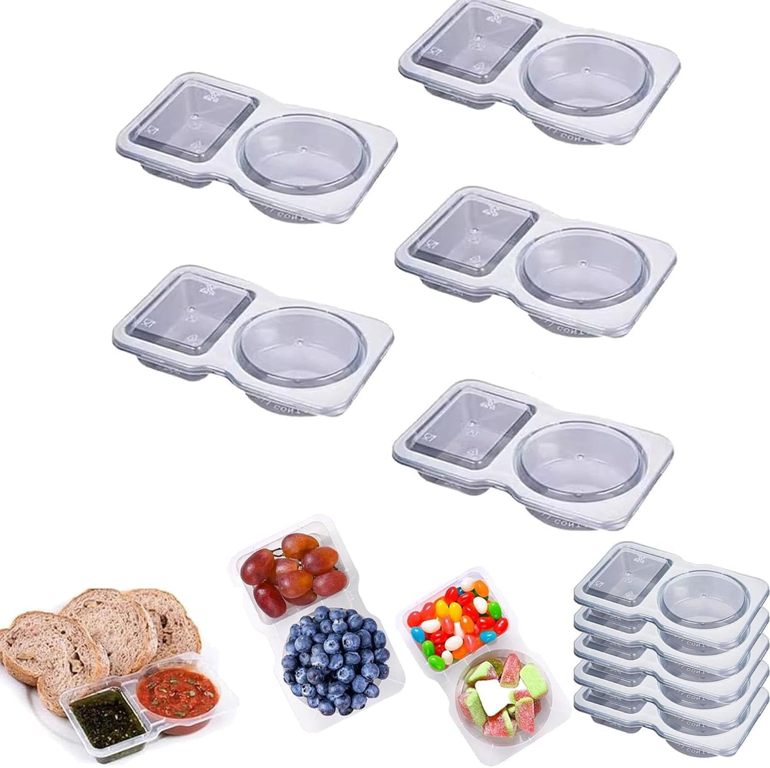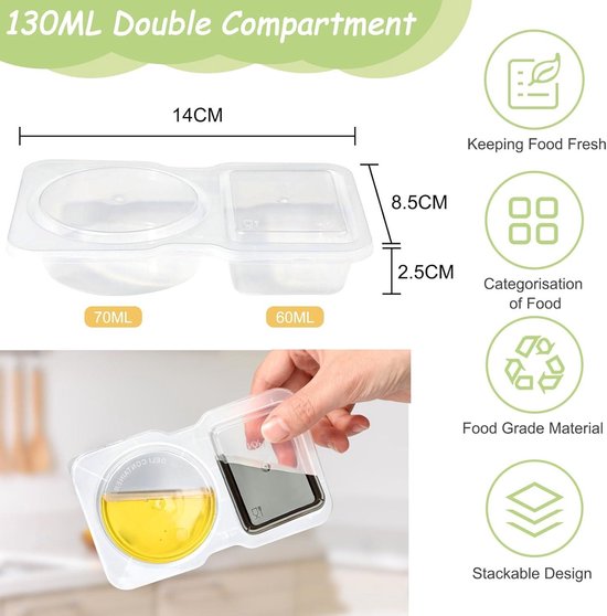 Profitez d'une variété de saveurs dans un seul emballage pratique. Emballage polyvalent : comprend 20 récipients de petite taille et ils sont utilisés pour les condiments et les collations. Passe au micro-ondes (plage de température : +120 ℃/-20 ℃) et au réfrigérateur. Contenant à Collation, Contenants à Double Compartiment Pour Bo Te Collation De Voyage R Utilisable Condiments Avec Couvercle 5 Pcs Design pratique à double compartiment : notre récipient à condiments à double compartiment dispose de deux compartiments séparés, vous permettant de stocker et de transporter différentes collations, vinaigrettes ou desserts sans vous soucier qu'ils se mélangent. Fabriqués à partir de plastique de qualité alimentaire, nos récipients à condiments double couche sont robustes, durables et passent au lave-vaisselle. Des chaussures aux vêtements, des tenues de sport aux accessoires. Atteignez vos objectifs nutritionnels sans effort, peu importe où vous allez. Réutilisez-les plusieurs fois ou jetez-les pour un nettoyage sans tracas. Réutilisable et sûr : chaque récipient mesure 14 cm x 8,5 cm / carré 60 ml, rond 70 ml. dans les boîtes à déjeuner et convient pour les projets d'art et d'artisanat. Surflyee Lot De 20 Boîtes à Condiments à Double Compartiment Fabriqués en plastique épais et portables réutilisables, ces récipients sont construits et peuvent être facilement stockés dans le réfrigérateur... Parfait pour les restaurants, les camions de nourriture, les services de livraison, les événements spéciaux et les restes, ces conteneurs offrent un confort et une fonctionnalité exceptionnels.