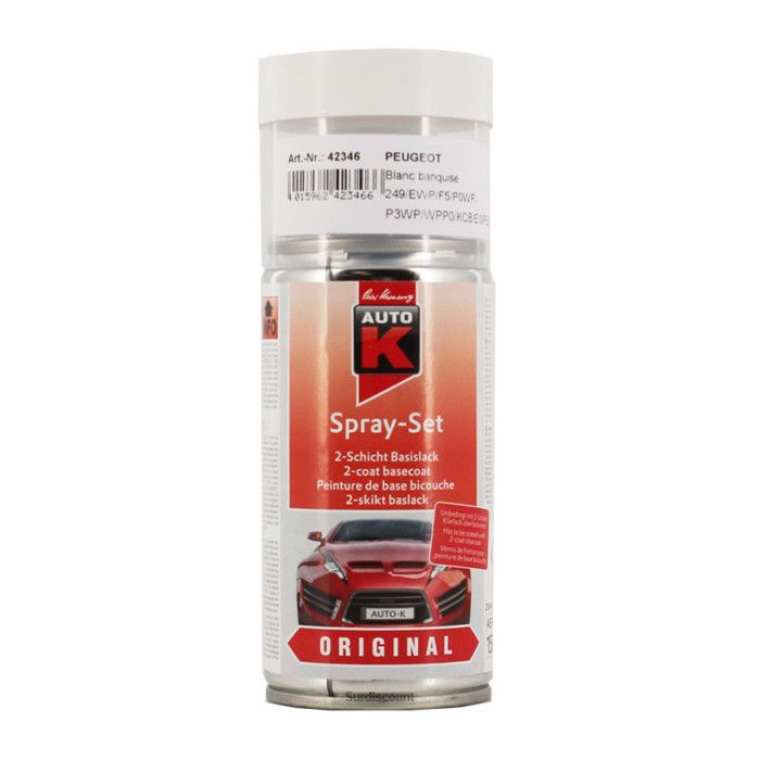 Bombe de peinture pour voiture compatible avec PEUGEOT 106 EWP BLANC BANQUISE Bombe de peinture couleur d'origine constructeur, 400 ml, ATTENTION ! Il s'agit d'une peinture en aérosol compatible avec PEUGEOT produite à la demande dans le code couleur de carrosserie d'origine EWP. Peinture EWP (P0WP / P3WP) Blanc Banquise pour Citroen Peinture Bombe Blanc Bombe Peinture Polyuréthane Carrosserie Pour Dans Couleur Peugeot 106 Bombe de peinture voiture hydro Peugeot 400ml BLANC BANQUISE EWP · Fabriqué en France · Livraison rapide 48h · Plus de 100 000 teintes · Testé approuvé par des pros...