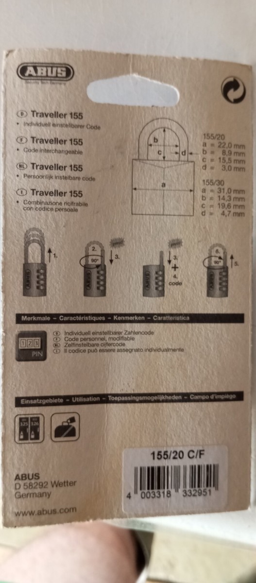 Cadenas Abus Traveller 155 / 20 Par exemple pour la protection de bagages, de casiers dans les écoles et les centres sportifs, de cassettes, de coffres, de caisses à outils, d'installations électriques, etc Le cadenas robuste pour le quotidien : cadenas à combinaison pour fermer les valises, les coffrets, les casiers et bien d'autres choses encore - pour protéger... Cadena Code Abus Serrure à Combinaison 155/20 Aluminium 20 Mm Cadenas Abus Ces cadenas compacts conviennent à une variété d'utilisations et d'utilisateurs différents, grâce à leur système de verrouillage spécial. Les applications incluent la sécurisation de bagages, de boîtes à outils ou de casiers dans les clubs de sport Boîtier robuste en zinc coulé sous pression avec anse en acier , Code personnalisable à 3 chiffres