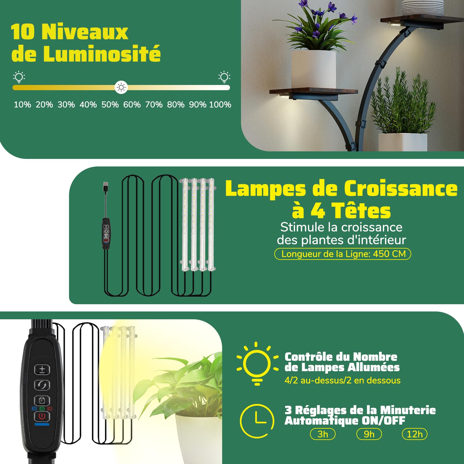 Lampe Pour Plante Intérieur JUSTOGO Support De Plantes De 157,5 Cm Avec Lampe De Croissance à Support Pour Plantes Intérieures 【Support de plantes à 7 niveaux, 157,5 cm de haut】Mesurant 157,5 cm de haut, cette étagère pour plantes offre 7 niveaux pour s'adapter à différentes tailles et formes de pots, parfaite pour présenter une gamme de fleurs et de plantes d'intérieur de petite ou moyenne taille. En outre, il peut également servir de présentoir pour d'autres décorations, ajoutant une touche créative à votre décoration d'intérieur. Support pour plantes d'intérieur avec lampe de culture, 9 VEVOR Support Plantes Intérieur avec Lampe de Croissance, Étagère Plantes à 6 Niveaux Métal, Hauteur 180 cm, 192 W, avec Roulettes, Lampe à Spectre Complet... Son design moderne en fait un cadeau idéal et attentionné pour les amateurs de plantes, apportant la joie du jardinage à l'intérieur. Pour plus de sécurité, il comprend une sangle de meuble pour fixer le support au mur, l'empêchant de basculer si vous avez des enfants ou des animaux domestiques. Assemblage facile et sécurité : pas besoin de vous soucier de l'assemblage, ce support de plante est conçu pour un assemblage facile, il est livré avec des instructions claires et tous les outils dont vous avez besoin, vous permettant de l'installer rapidement sans aucun souci. Il s'adapte parfaitement à n'importe quel coin ou mur vierge de votre salon, chambre, balcon ou terrasse. Idéal pour la décoration et le cadeau : transformez votre espace intérieur avec son élégant design incurvé en « S », ce support de plantes de sol sert de pièce décorative élégante et moderne. Achetez maintenant chez VEVOR. Il garde également vos plantes organisées sans prendre beaucoup de place.