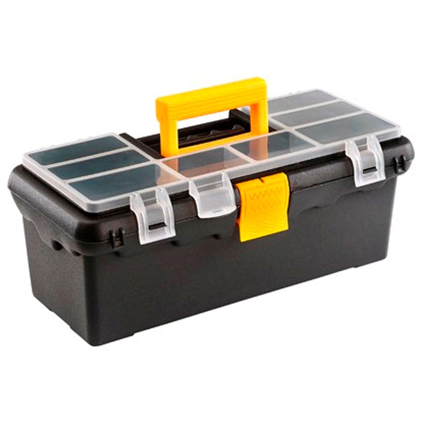 Ces petits compartiments permettent de trier et de trier les vis, écrous, clous, rondelles, etc. En outre, la couverture est transparente afin que vous puissiez facilement distinguer les différentes pièces que vous y rangez. 👍 Multifonction : notre boîte à outils portable est idéale pour un usage domestique et professionnel, les travaux de bricolage ou de plomberie, les réparations électriques et mécaniques., ., . Avec une capacité de 8 litres et des dimensions d'environ 22,5 x 34 x 15,5 cm (H x L x l), elles sont parfaites pour ranger des documents, des accessoires, des outils ou tout autre objet nécessitant un stockage fiable et ordonné Notre boîte à outils en plastique pratique et utile comprend un grand compartiment inférieur et 5 compartiments fixes sur le couvercle qui peuvent être divisés en 8 compartiments maximum en plaçant les séparateurs amovibles. Remarque : la boîte est disponible en deux modèles (tout noir / noir et jaune) qui seront envoyés de manière aléatoire selon disponibilité en stock. Façade et cadre amovibles.Dim.43 x 31 cm. Stockage de petites pièces : les compartiments sur le dessus de la boîte permettent de trier et de trier les vis, les écrous, les clous, les rondelles, etc. En même temps, il est léger et facile à transporter grâce à sa poignée intégrée Produit fabriqué en Espagne. Caisse en plastique avec couvercle Trieur 8 Caisse À Outils Boîte à Outils En Plastique Avec Poignée Et Plateau Trieur Plastique 8 Compartiments Tradineur Panier à linge en rotin avec couvercle et poignées, panier à linge en plastique, imitation osier, fabriqué en Espagne, blanc, 38 l, 49 x 38,5 x 29,5... Le produit est fabriqué en plastique PP de haute qualité, durable et capable de résister à l'usure.