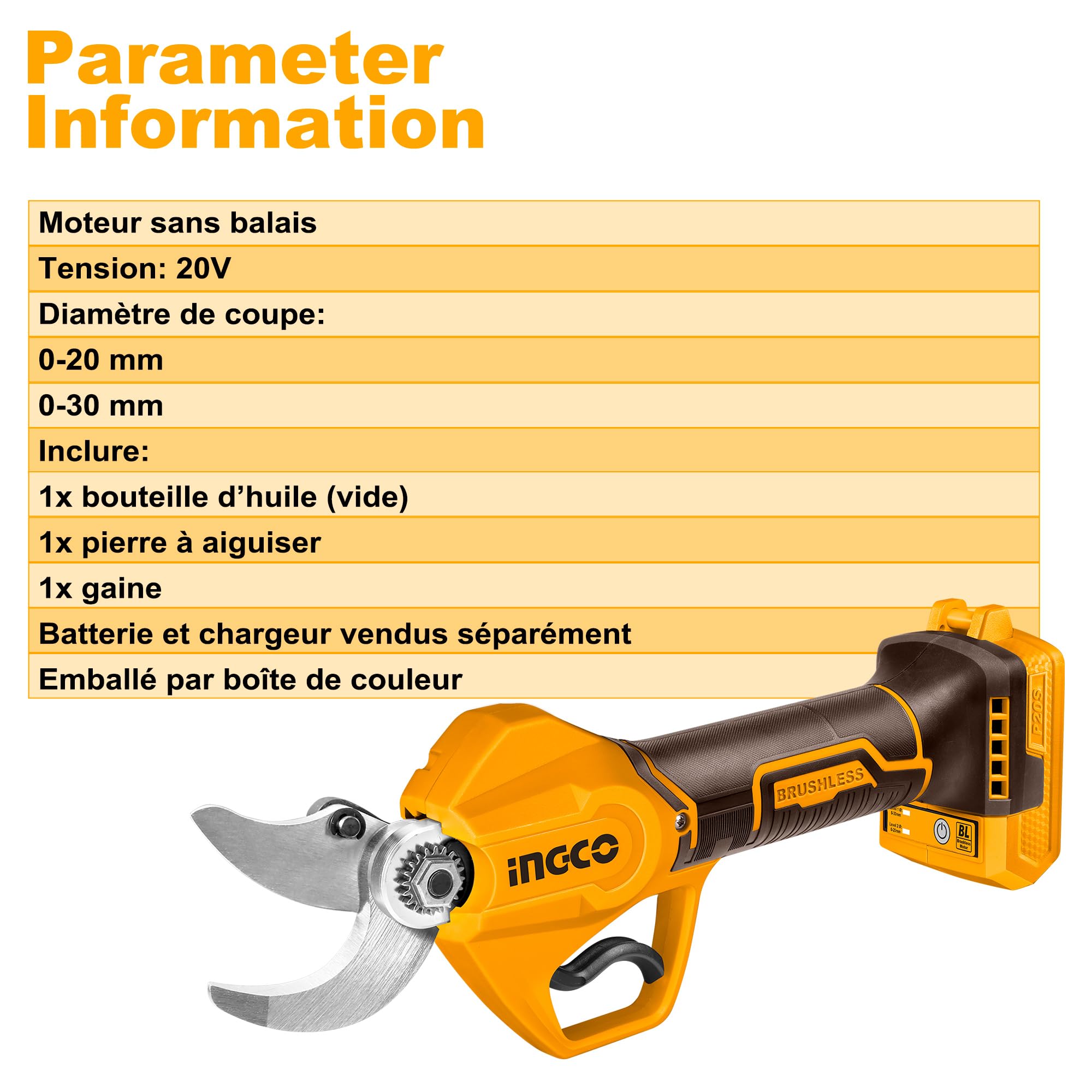 【 Lames SK5 】Lame d’acier à haute teneur en carbone SK5 robuste, il est facile de couper les branches (0-25mm). INGCO Visseuse à Choc Sans Fil 20V 1 200+ P20s électriques 2 19 ans d’INGCO 3 2000+ outils INGCO Marteau Perforateur Sans Fil 20V 【 Ce Que Vous Obtenez 】1x sécateur +1x bouteille d’huile+ 1x Pierre à affûter +1x batterie 2., 0Ah +1x chargeur +1x boîte de transport INGCO Scie Circulaire Sans Fil 20V Coupe Bordures sans fil 20V Batterie lithium 2AH Chargeur Jeu de... Description du produit INGCO Sécateur Électrique Sans Fil 20V Moteur sans brosse, 4800tr/min, 185mm, Capacité de coupe: 45 degrés: 45mm, 90 degrés: 65mm INGCO Perceuse Visseuse à Percussion Sans Fil 20V INGCO CGSLI20682 Mini tronçonneuse sans fil Lithium-ion 20V (2 batteries m, Capacité du mandrin: 13 mm, Paramètres de couple: 22+1+1 Secateur A Batterie Sécatur à Battri 20V Diam. D Coup 30 Mm Motur Brushlss Vndu Secateur Electrique Sans Fil Moteur sans balais, 0-1100 tr/ min, 0-5400 bpm, 2., 0J; capacité de perçage max. Moteur Sans Balais, 0- 550/2000 tr/min, 0-30000 bpm, Couple maximum: 60 N. Moteur sans balais, 0-1200/0-1800/0-2200 tr/min, 500/650N., m Diamètre de coupe 20–30 mm Fonctionne avec batterie 20V 🔋 Poignée en métal plastique pour une prise en main confortable Style moderne jaune & noir Prix : 269dt #INGCO#ingcotools#SécateurÉlectrique #secateursansfil #20v #jardinage#outilsjardin#GardenTools #élagage#bricolage#outilsprofessionnels #outilsdejardin#GardenWork Le kit comprend: 1x sécateur sans fil, 1x 2., 0ah batterie, 1x chargeur, emballé par la boîte de couleur