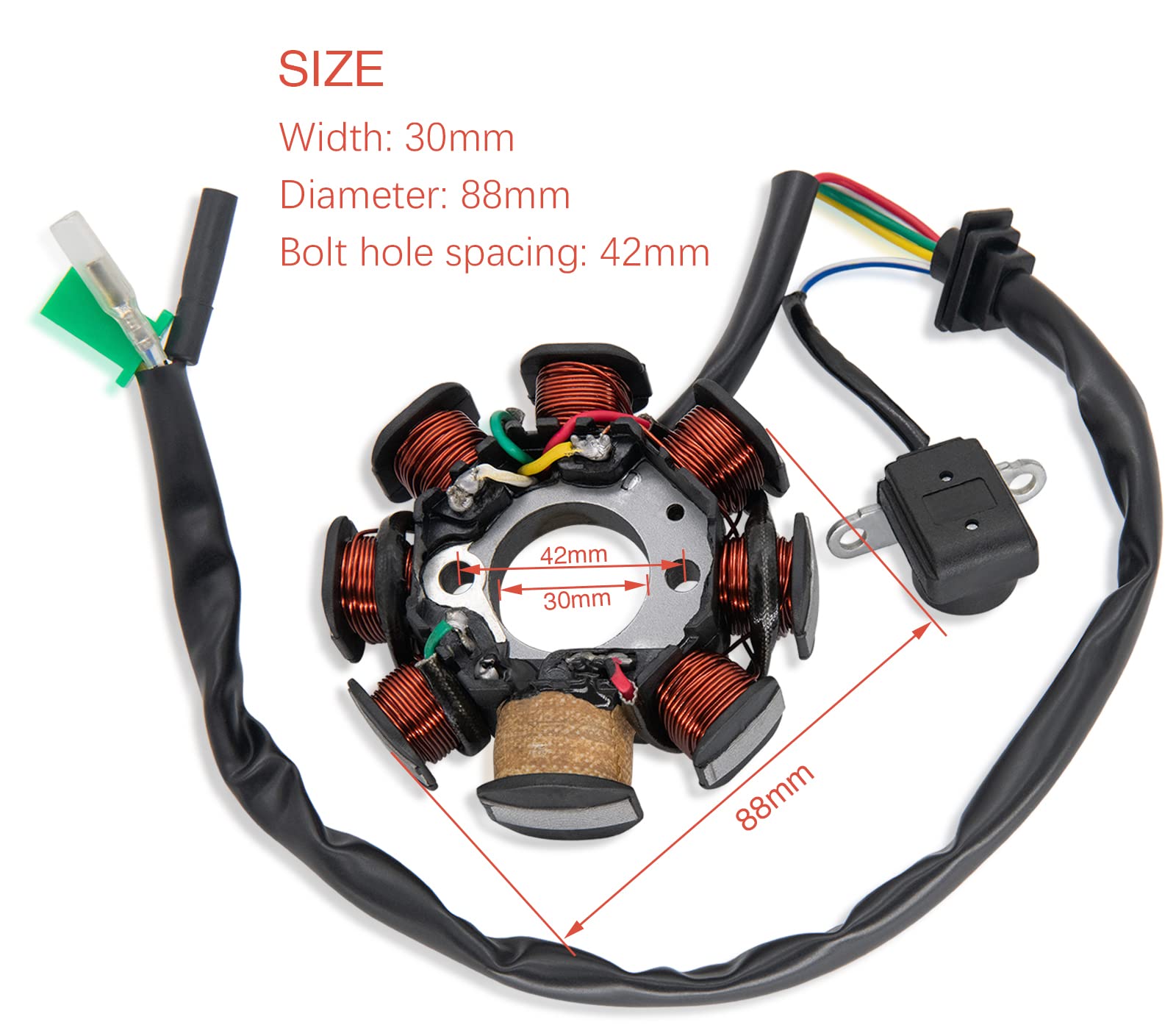 A/C à onde complète., Diamètre: 88 mm., Largeur: 30 mm. Espacement des trous de boulon: 41 mm. Service client: Tous les produits sont fabriqués selon les normes de qualité les plus strictes pour que vos modèles restent solides et robustes. Fitment]Le stator d'allumage convient aux moteurs GY6 125cc 150cc 4 temps QMI152, QMI152157, QMJ152, QMJ157 Scooter Moped Go-Kart Pocket Bikes ATV Dirt Bike Dune Buggy. [Wide Application]La magnéto stator AC 8 bobines 5 fils convient à la plupart des marques de scooters chinois tels que TaoTao, Buyang, Coolsport, Kazuma, Sunl, NST, etc Français: Caractéristiques: Nouvelle bobine de stator magnéto de haute qualité. Compatibilité: Compatible avec: scooter, VTT, scooter, cyclomoteur, kart et buggy GY6 ou GY6 Clone Engine. Maxipièces. Compatible avec: scooter, quad, scooter, cyclomoteur, kart et buggy GY6 ou Clone Engine GY6., Pour moteurs 125cc et 150cc GY6 4 temps QMI152, QMI152157, QMJ152, QMJ157., Convient à la plupart des Pit/ Dirt bike d'importation chinoise, presque toutes les marques de vélos de Chine, telles que TaoTao, Buyang, Coolsport, Jonway, Znen, NST, BMX, Kazuma, Sunl, Roketa, AIM-EX, etc. Convient à la plupart des Pit/ Dirt bike d'importation chinoise, presque toutes les marques de vélos de Chine, telles que TaoTao, Buyang, Coolsport, Jonway, Znen, NST, BMX, Kazuma, Sunl, Roketa, AIM-EX, etc. (21 pouces) Nombre de bobines: 8., Style de prise: 4 broches, femelle (3 broches utilisées) avec deux broches simples séparées. Bobine 8 Pôles 5 Fils Bobine D'allumage Stator Magnétique 8 Pôles Pour Scooter GY6 125CC 150CC - Pièce De Rechange Qualité Supérieure Alternateur Quad Chinois Stator D'allumage, Stator D'alternateur, 8 Bobines, 3 Broches, 5 Fils 152QMI /157QMJ (GY6 125 Compatible avec les moteurs GY6 de 50cc à 125cc, il offre une puissance de sortie optimale grâce à ses 6 bobines et fils de cuivre de qualité. Facile à... Diamètre du trou de boulon: 6 mm.