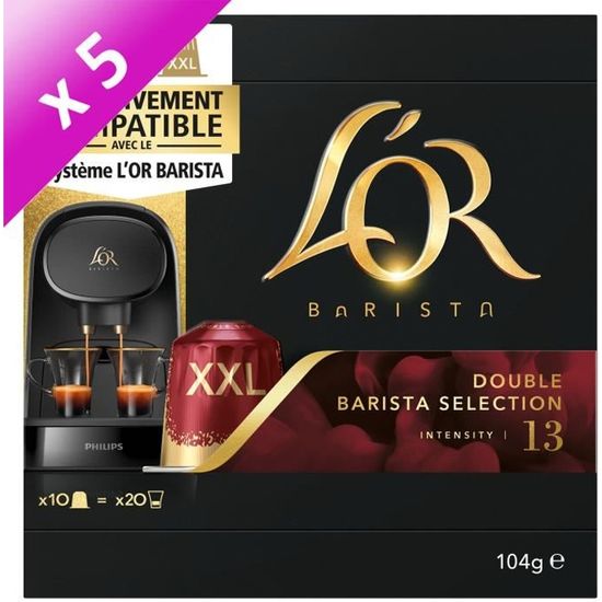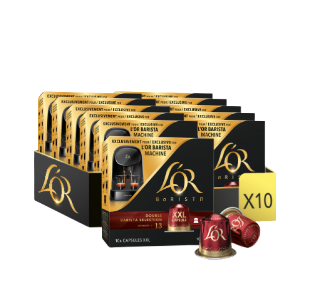 Avertissement De Sûreté Conserver dans un endroit frais et sec. Torréfié à la perfection pour vous offrir un goût exquis et une longueur agréablement puissante après dégustation Capsules en aluminium recyclable, garantissant une conservation optimale des saveurs. Capsules XXL exclusivement compatibles avec la machine à café L'OR BARISTA... produit 1: CAPTIVEZ VOS SENS avec ce ristretto complexe. Riche couche de crème aux saveurs exaltées et arôme attrayant : chaque élément soigneusement étudié a été choisi par les Maîtres Torréfacteurs L'OR pour éveiller les sens. Déconseillé aux femmes enceintes et aux enfants. Description du produit L'OR - Capsules XXL - Double Barista Selection - Intensité 13 - Corsé - Compatibilité Exclusive L'OR BARISTA® - 5 lots de 10 capsules aluminiumIntense et puissant, le Double Barista Selection est un mélange revigorant, parfait pour se réveiller. Un mélange expert réalisé à partir d'une sélection rigoureuse de grains pour créer un profil de saveur intense et plein de caractère Un ristretto idéal pour un voyage intense inoubliable. L'OR propose des capsules XXL de la sélection Double Barista, avec une intensité de 13, offrant un café corsé et riche en saveurs. Ces capsules en aluminium sont compatibles exclusivement avec le système L'OR BARISTA®. Chaque lot contient 10 capsules, et vous pouvez en acheter 5 pour profiter d'un café de qualité supérieure à domicile. L'OR met l'accent sur une expérience café haut... produit 2: Puissant - Expressif - Absolu Quelle Capsule L'OR - Capsules XXL - Splendente - Intensité 7 - Torréfaction Légère - Compatibilité Exclusive L L Or Capsules Nespresso L'Or Barista Café - 50 Capsules Ristretto Intensité 11 - Compatibles L'Or Barista (lot de 5 x 10 Capsules)Avec les capsules en aluminium L'Or DOUBLE RISTRETTO, savourez un double ristretto ou deux tasses de ristretto à la fois. Pensé pour être dégusté chez vous, ce ristretto exceptionnel de qualité professionnelle présente une torréfaction complexe et foncée, pour un goût de ristretto unique et persistant. produit 1: UN RISTRETTO INTENSE explosant en bouche. Cette double capsule a été spécialement conçue pour la machine L'OR BARISTA et prépare deux tasses de qualité professionnelle à déguster en même temps. LOT DE 4 - L'OR Barista - Double Barista Sélection Intensité 13 - 10