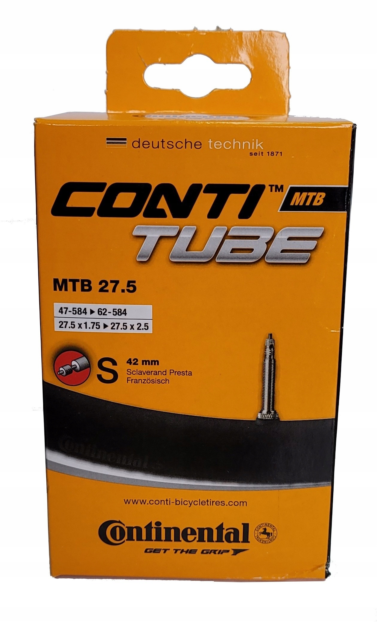 CAMARA DE AR 27.5 X 1,75 / 2.5 CONTINENTAL PRESTA - ProSport Bike Tube interne léger en butyle pour cyclisme en montagne avec valve Presta de 52 mm Camera Continental pentru roata de 27.5*1.75/2.5 cu valva Presta - MTB... Continental Conti Tubes Camera Continental Pentru Roata De 27.5*1.75/2.5 Cu Valva Presta - MTB Chambre A Air 26 Pouces Butyl rubber mountain bike tube Unitube size fits 1.75 - 2.5in section mountain bike tyres Presta valve Weighs 200 grams All tubes have a seamless construction, with a mould-cured vulcanisation, to ensure uniform roundness Pour pneus de vélos de montagne