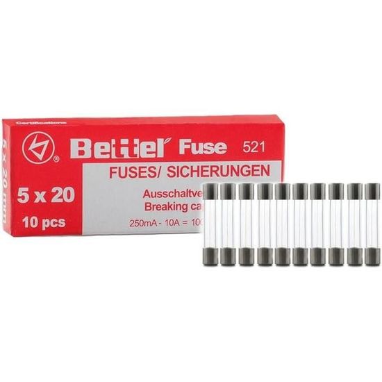 f2 a 2 A 250 V Quick Blow 20 x 5 mm verre fusibles , Lot de 10 Achetez des fusibles assortis en gros et au détail, en Irlande et au Royaume-Uni Construction en verre de haute qualité pour une longue Taille de 5 x 20 mm pour des applications polyvalentes. Protège les circuits électriques jusqu'à 250 V contre les surintensités et les courts-circuits. Facile à installer dans divers appareils électriques. Garantit un fonctionnement sûr et protège contre les risques électriques Lot De 3 Fusibles Verre 2.5 A, 5 X 20 Mm Verre - Leroy Merlin Nom du produit : Fusible à tube de verre Quantité : 20 Caractéristiques : Haute vitesse (F) Faible capacité de...