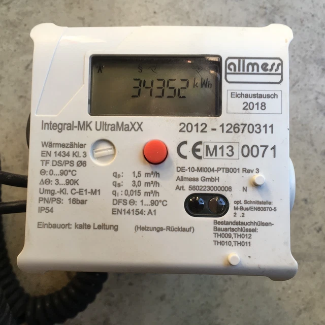 Fühlerkabellänge: 1,5 m Anschlussgewinde EAS: M77 x 1,5 Weitere Technische Details entnehmen Sie bitte dem Bedienungsanleitung des Herstellers. Bitte beachten Sie beim Zählerwechsel die Neuerungen der MID-Richtlinie und der damit verbundenen Umstellung auf Direktmessung - Bestandstauchhülsen sind ab dem 01.11.2016 nur noch bedingt zulässig La plate-forme de compteur vous offre la plus grande variété de produits de qualité supérieure dans le domaine du sous-mètre. Le compteur de chaleur est intégré dans l'Allmess EAT (raccord encastré). Allmess Integral MK-UltraMaXX Wärmezähler Messkapsel 1,5 m³/h 560223100006 - Webshop Allmess Wärmezähler Integral-MK UltraMaXX 2,5 Mit Eichung 2023 4250199278421 Compteur de chaleur Allmess UltraMaxx Produit original Allmess pour le montage du compteur de chaleur UltraMaxx - Outil de montage pour tout le monde - Très facile à utiliser - Très durable grâce à sa construction robuste. Contenu de la livraison : 1 compteur de chaleur Integral-MK UltraMaxx Qn 1,5, 1 clé de montage Allmess MK-UltraMaxx Technologie ultrasonique et système de dosage Technologie à ultrasons et système de capsules de mesure - Pas de pièces mobiles dans le compteur - Utilisation inusable - Version comme compteur de chaleur (15 - 90 °C) - Cycle de mesure dynamique de la température 2/60 secondes - Interface optique - Sonde avant et arrière de 1,2 m - Câble de raccordement amovible - Montage mural possible par le calculatrice Le filetage de raccordement de l'EAT est M77 x 1,5., Allmess Integral-MK UltraMaXX Qn 1,5 TF 6,0 mm. WÄRMEZÄHLER ALLMESS INTEGRAL-MK UltraMax Qn 1,5 TF 6,0 2025 mit... Les compteurs de chaleur sont utilisés dans la technologie domestique et dans les domaines de chaleur proche et proche pour la détection de la chaleur ou de l'énergie froide selon la consommation et pour la facture individuelle des coûts de chauffage.