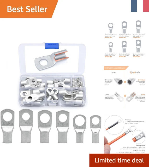 « Les extrémités des câbles de batterie sont un connecteur du câble filaire à l'équipement électrique qui sert à stabiliser l'installation et à empêcher efficacement les courts-circuits et les mauvais contacts. Ces cosses de batterie peuvent être serties ou soudées aux extrémités du fil selon vos préférences. Cosses de fil ouvertes OT 30A - 10 pièces. COSSES TUBULAIRES DE 10 MM2 A 70 MM2 Contenu de l'emballage : 30 connecteurs de bornes de batterie dont 10 connecteurs OT-10 A, 10 connecteurs OT-30 A, 10 connecteurs OT-60 A à 3 spécifications. La... Raccord Pneumatique Lot De 30 Cosses De Câble En Cuivre Très Résistantes 10 A 30 Cosses Electriques Les cosses de fil de cuivre sont fabriquées en cuivre violet robuste, qui a une bonne conductivité, résistant à la chaleur et à la corrosion pour garantir la fiabilité de la connexion. Haute qualité cosses de cuivre 1 0 aux prix de gros Notre connecteur de terminal à anneau ouvert répond généralement aux normes de l'industrie. Lot de 10 cosses ouvertes OT 60A Largement utilisé dans la voiture, l'éhicle, le camping-car, le bateau, les panneaux solaires, les machines, l'alimentation électrique, les appareils ménagers, les chemins de fer, la construction navale, l'aviation, l'ordinateur ou d'autres équipements automatiques, etc.