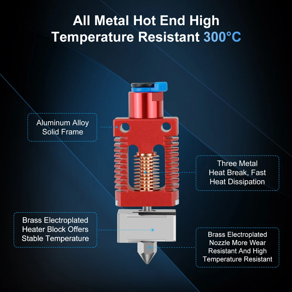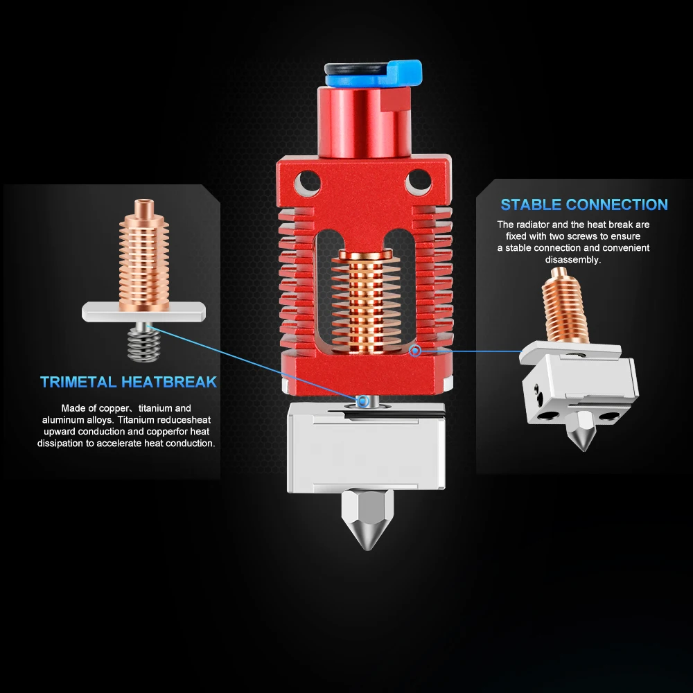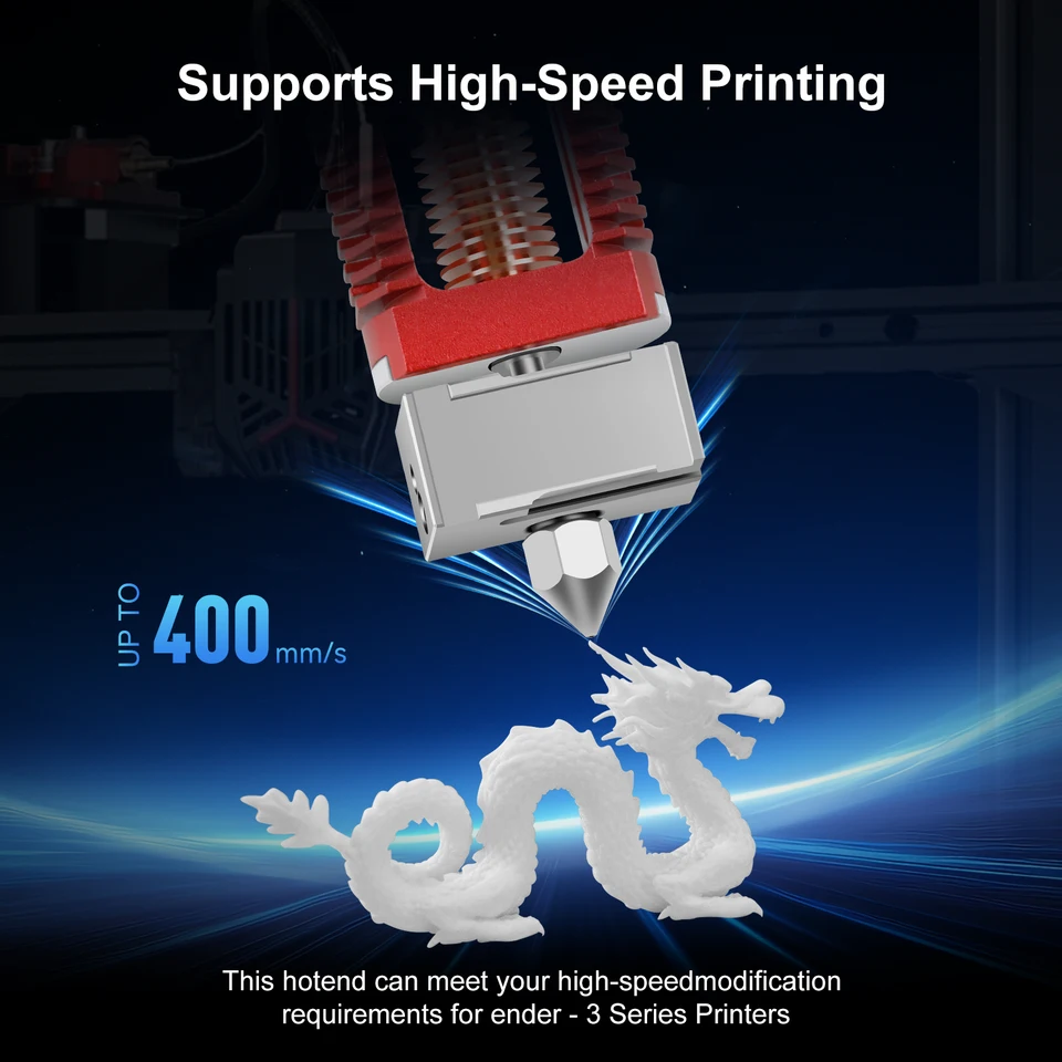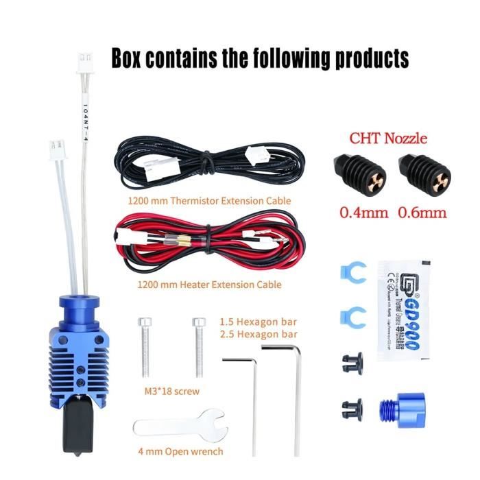 Hotend upgrade compatible Creality Ender 3 & V3 Plus, chauffe rapide, extrusion fluide et précision supérieure pour impressions 3D Ender 3 Hotend Mise à niveau pour imprimante 3D Voron 2., 4 Ender 3 V2 Pro Cr10 Ender 5 Pro/Plus Ender 6 Rapido Dragon Hotend Kit de pièces pour imprimante 3D Voron 2., 4 Ender 3 V2 Pro Cr10 Ender 5 Pro/Plus Ender 6 Rapido Dragon Hotend Kit de pièces pour imprimante 3D 24 V Chauffage en céramique tout en métal Contenu de l'emballage : (1 jeu de pointes chaudes comme indiqué sur la première photo) ; options du micrologiciel : configuration du micrologiciel Marlin : NTC 100K MGB18-104F39050L32 Thermistance 4,7 k Pull-Up Ender 3 Hotend - Kit de actualización bimetálico de metal compatible Creality Ender 3 Firmware Ender 3 Hotend Mise à Niveau Pour Imprimante 3D Voron 2.4 Ender Ender 3 V3 (Cependant, la température d'impression maximale du chauffage 24 V 48 W et de la thermistance est de 300 °C, de sorte que toute la tête de chaleur ne peut être utilisée que pour imprimer jusqu'à 300 °C., Remarque : Conseil : si vous êtes à la recherche d'une tête à air chaud qui peut imprimer à des températures plus élevées et des vitesses plus rapides sans générer de chaleur, alors cette tête à air chaud sera votre meilleur choix. Les buses amovibles peuvent être facilement remplacées, ce qui permet d'économiser du temps. Par rapport à l'extrémité chaude Chc normale, le tube chauffant en céramique et la thermistance de cette extrémité chaude sont séparés au lieu de souder, les utilisateurs peuvent le remplacer très facilement sans remplacer l'ensemble du kit de bloc chauffant. Thermistance : NTC 100K MGB18-104F39050L32, suivi jusqu'à 22-33 mm³/s. Compatibilité Hotend : il y aura deux adaptateurs de connecteur différents. Compatible avec les imprimantes 3D Voron Series, Ender 3, ender 3 Pro, ender 3 V2... Compatible avec les imprimantes 3D Voron Series, Ender 3, ender 3 Pro, ender 3 V2, Ender 5 Series, ender 2 Series, ender 6, CR10 Series, CR10S.
