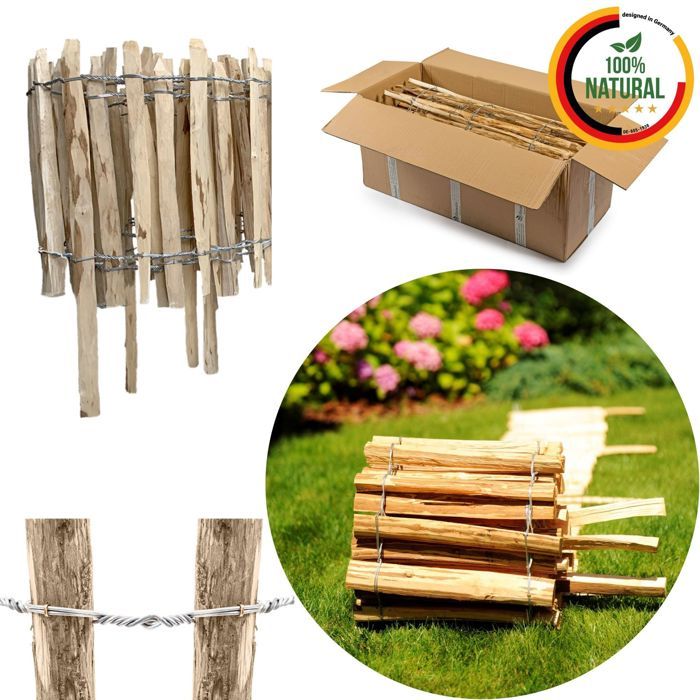 Clôture en Piquets de Noisetier – Naturelle et Élégante Une clôture en piquets de noisetier est le choix parfait pour ceux qui apprécient un style naturel et une grande durabilité. Palissade Bois Jardin sur CLÔTURE DE JARDIN NOISETIER - SLAP PALISADE Une clôture de jardin faite de bâtonnets de noisetier fendus tissés sur du fil de fer. DURABILITÉ : Le fil galvanisé a une épaisseur de 1,8 à 2 mm, il est extrêmement robuste et garantit la stabilité de la construction DIMENSIONS : Espacement entre les lattes 4-5 cm, Hauteur 120 cm, Longueur 5 m – idéal pour une solution de clôture individuelle et stable La clôture à enfoncer en noisetier permet une bonne aération et laisse passer la lumière, évitant ainsi l'ombrage des plantes. La clôture doit être fixée aux poteaux enfoncés dans le sol à l'aide d'un fil robuste, et des poteaux supplémentaires ainsi que des portails sont disponibles sur demande. NATUREL : Fabriquées en bois brut de noisetier non raboté, elles conservent leur charme rustique tout en offrant une solution robuste et fonctionnelle pour les jardins, les vergers, les parterres de fleurs ou les espaces de loisirs Les hauteurs varient de 35 cm à 120 cm, et les espaces entre les lattes sont disponibles en variantes de 4–5 cm ou 7–8 cm, permettant de choisir la densité appropriée en fonction de la fonction de la clôture. MONTAGE FACILE : La fixation de la clôture en noisetier se fait rapidement et facilement en l'attachant aux poteaux enfoncés dans le sol, à l'aide du fil de montage inclus dans le kit (30 pièces) Clôture Jardin Clôture De Piquet Bordure De Pelouse En Bois. Résistant À La Corrosion Bordure Bois Jardin Exterieur PRODUIT NATUREL : Cette clôture à moutons en bois est fabriquée à partir de bois de noisetier 100 % naturel avec une finition artisanale unique. INSTALLATION... BooGardi Bordure de parterre en bois - Plusieurs tailles - Hauteur 50